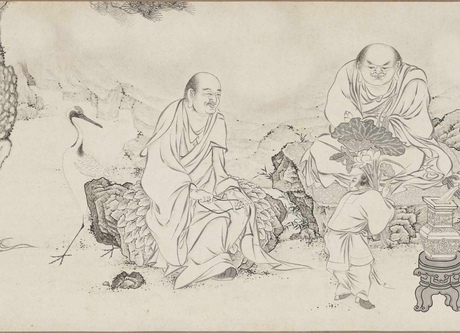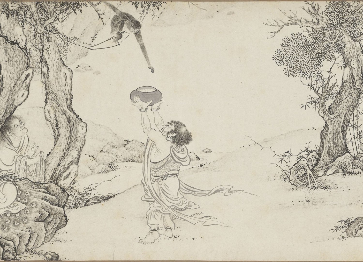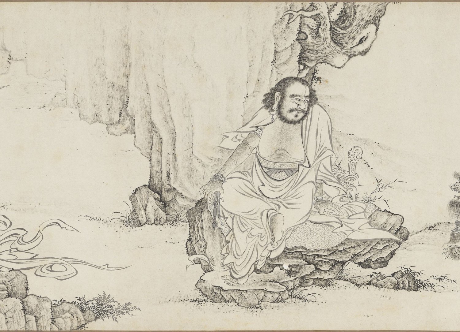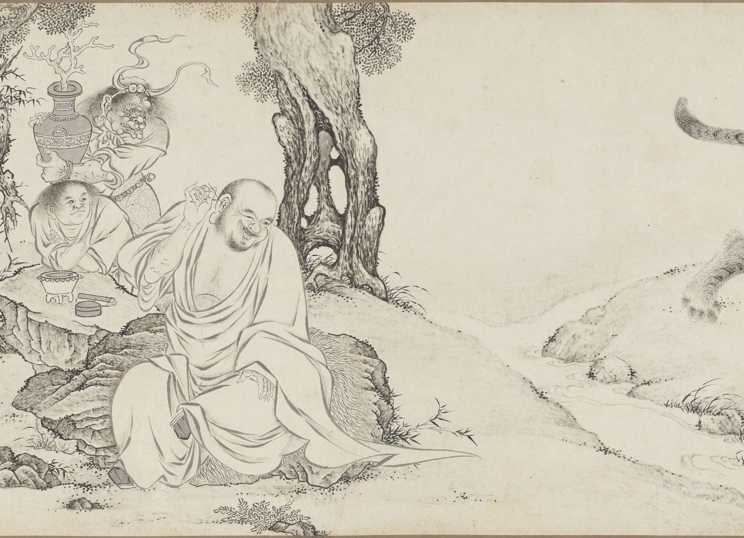 虽然画名中带有 “百佛”,画卷并未描绘一百尊佛陀列坐的场景,而是将视线聚焦于十六罗汉、天王、狮、佛道侍者、供养人、佛、鬼怪等宗教形象,以及寒林枯树、松、竹、莲荷、灵芝、猿、鹿、虎、龙等自然物象,还有香炉、宗教器用等器物。这种将神圣的佛教人物置于世俗化、自然化的山林野趣中的处理方式,褪去了宗教的威严感,极具东方文人画的禅意特质。