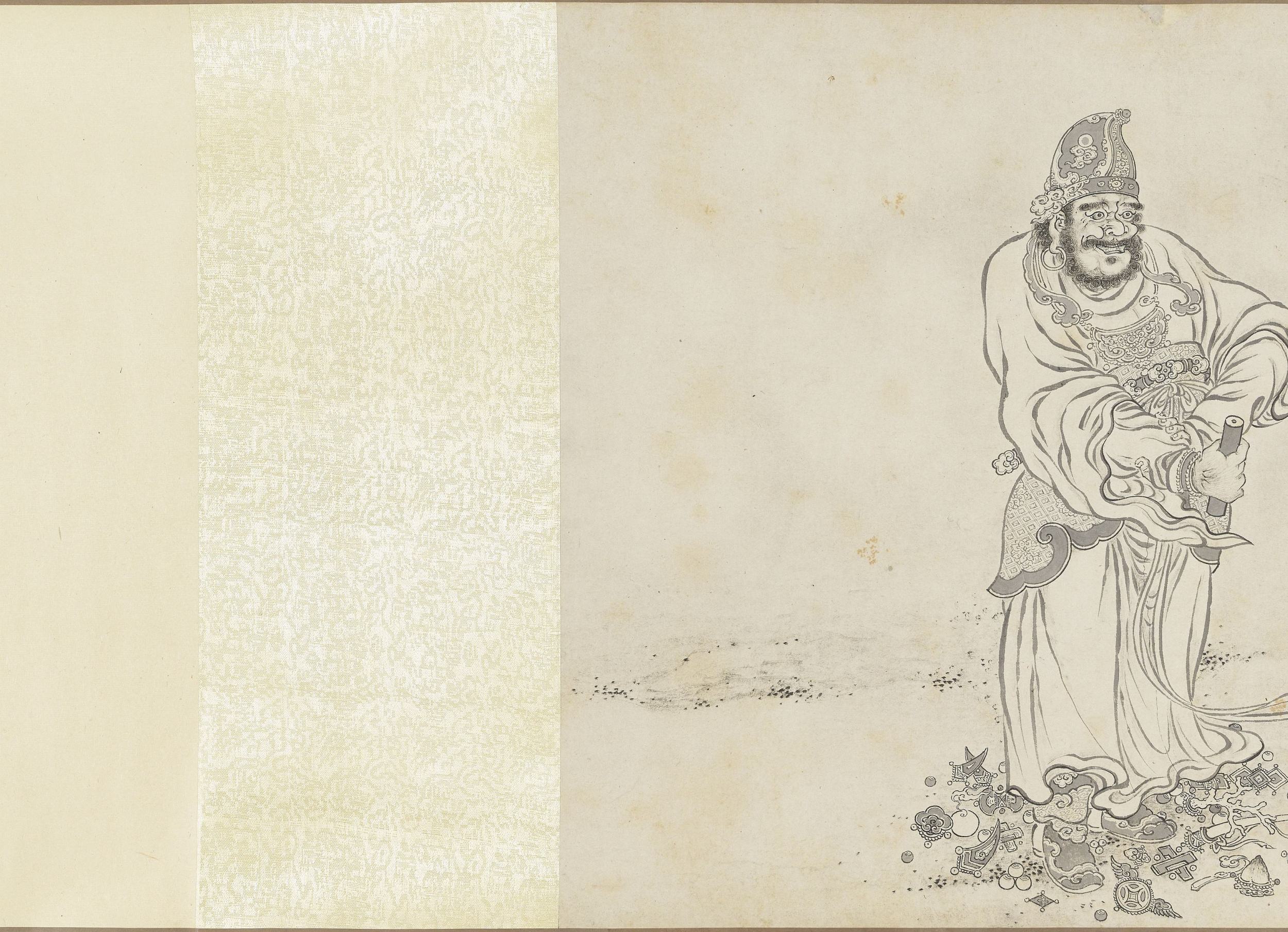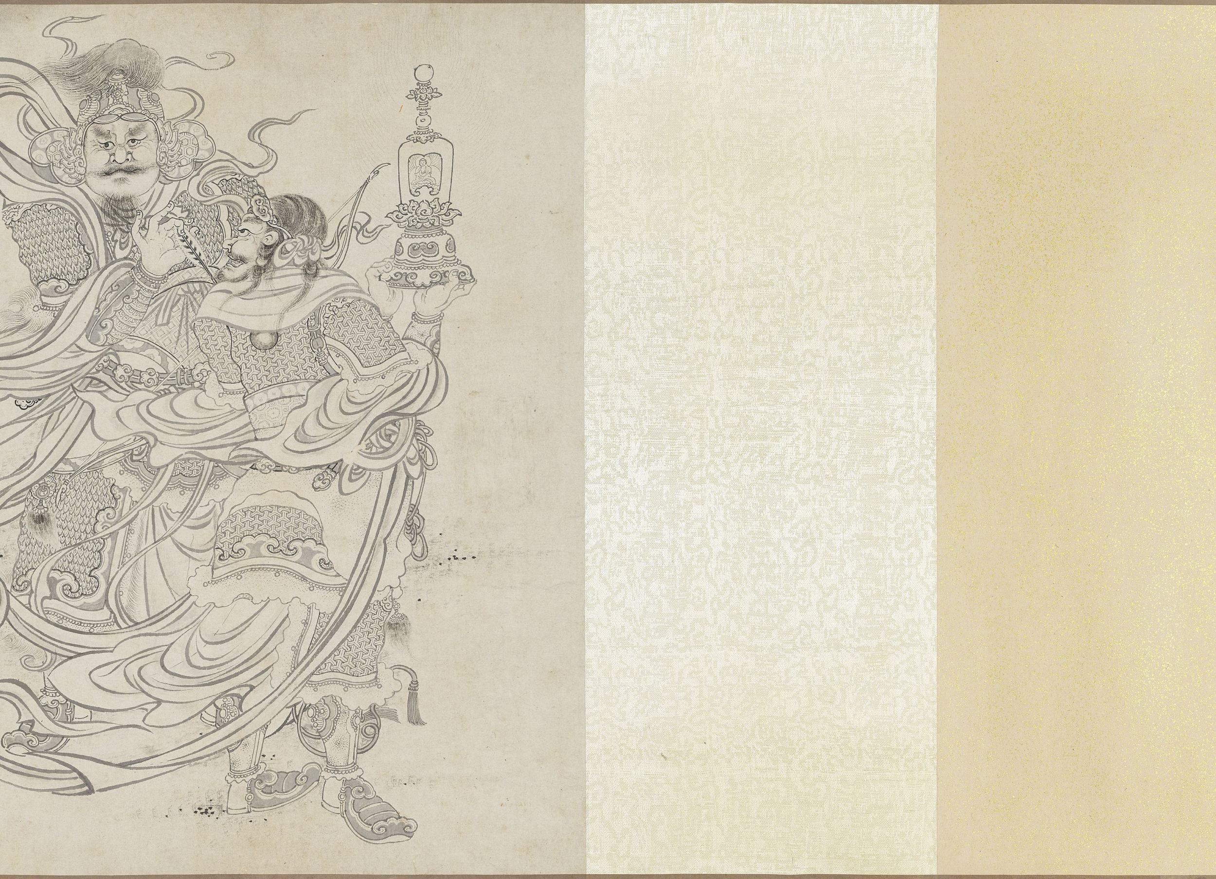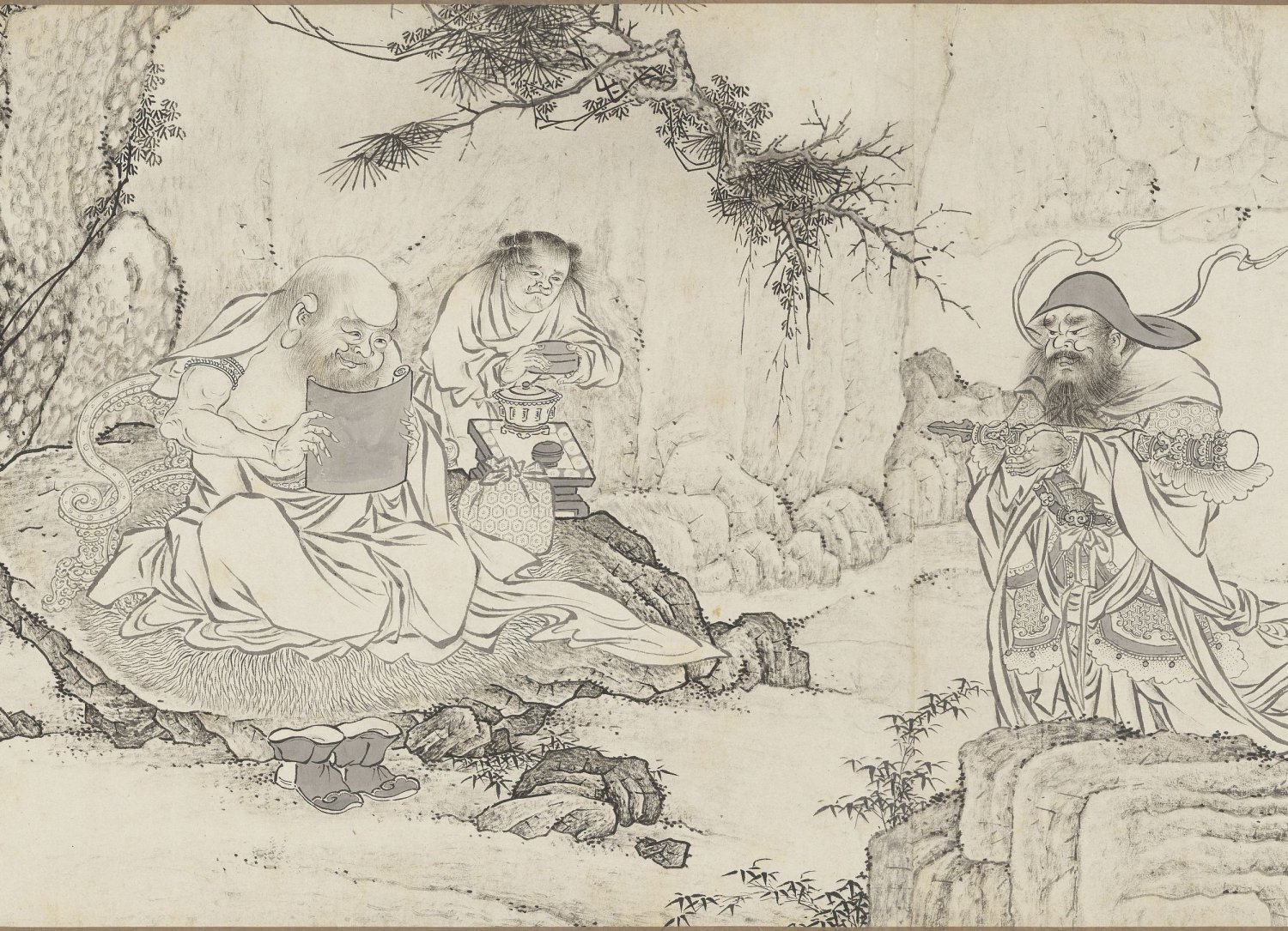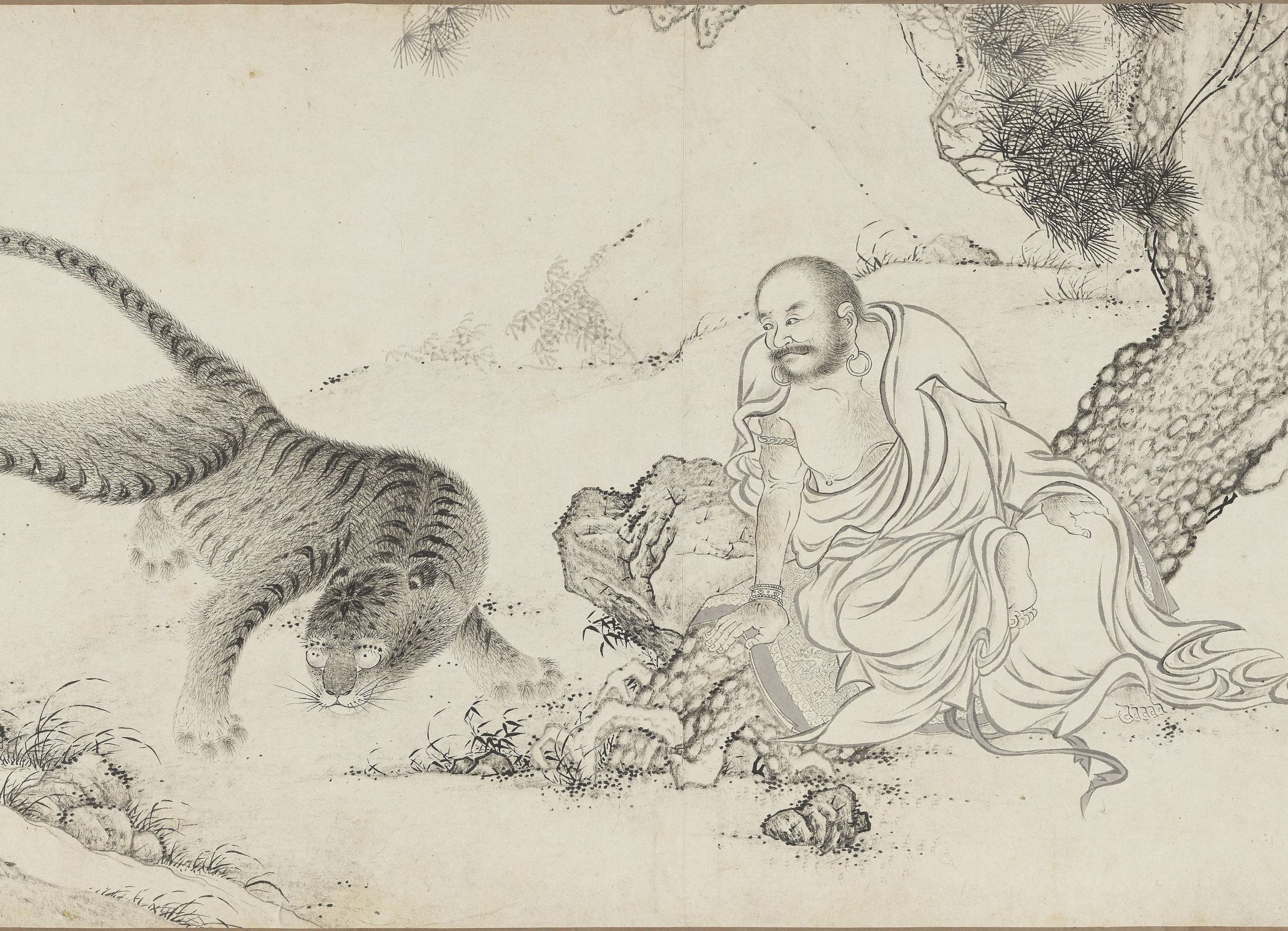 虽然画名中带有 “百佛”,画卷并未描绘一百尊佛陀列坐的场景,而是将视线聚焦于十六罗汉、天王、狮、佛道侍者、供养人、佛、鬼怪等宗教形象,以及寒林枯树、松、竹、莲荷、灵芝、猿、鹿、虎、龙等自然物象,还有香炉、宗教器用等器物。这种将神圣的佛教人物置于世俗化、自然化的山林野趣中的处理方式,褪去了宗教的威严感,极具东方文人画的禅意特质。