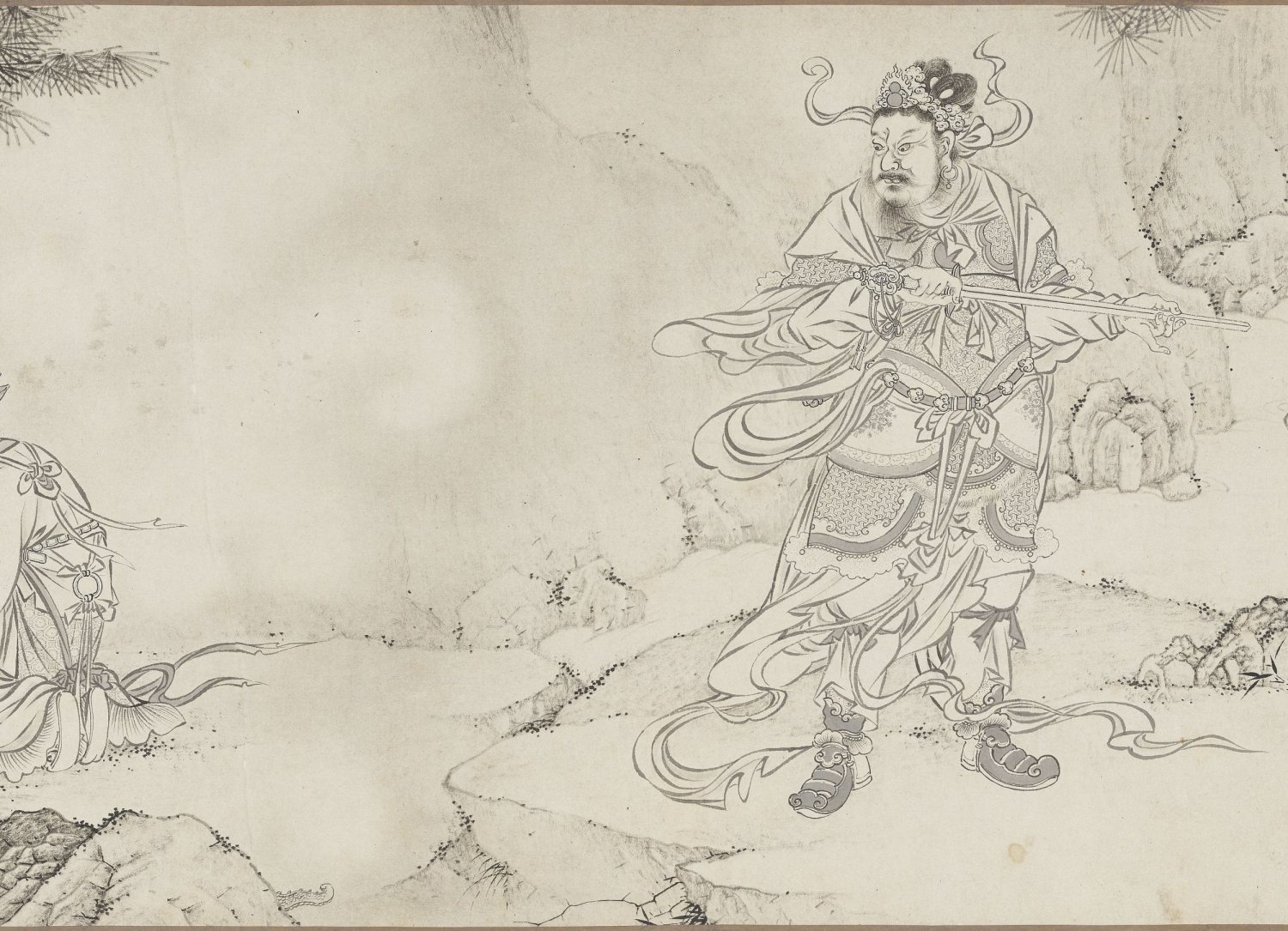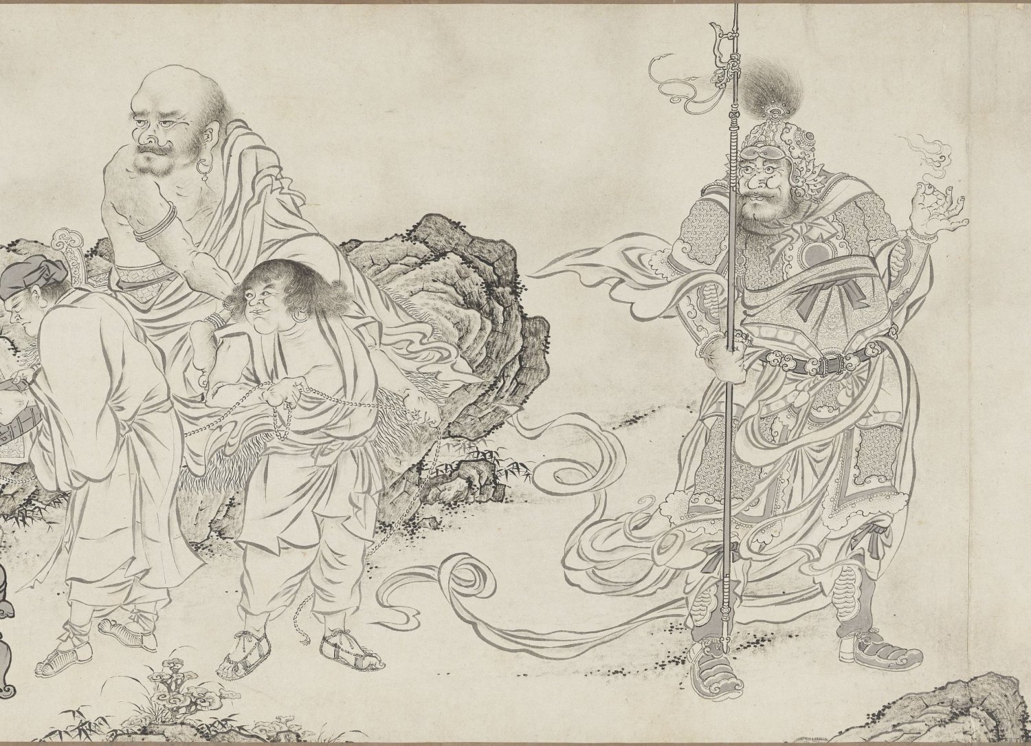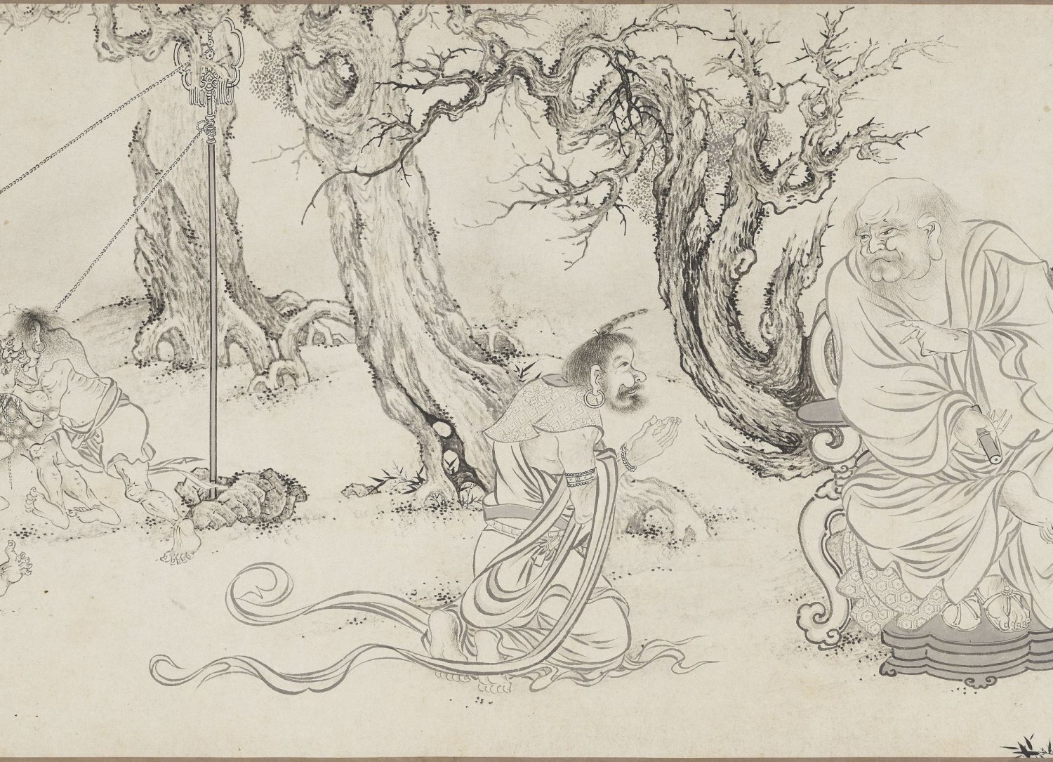 李公麟被誉为 “白描大师” 。此卷在技法上延续了 “李派” 罗汉画的范式。画中的树木、山石和动物多采用 “中锋” 用笔,苍劲浑厚;而人物的衣纹则大量使用了 “兰叶描” 。相比于李公麟真迹的简练文雅,此卷的兰叶描法在粗细变化上更为明显和繁富,线条的起伏转折呈现出一种飘举潇洒、意态生动的风神。
