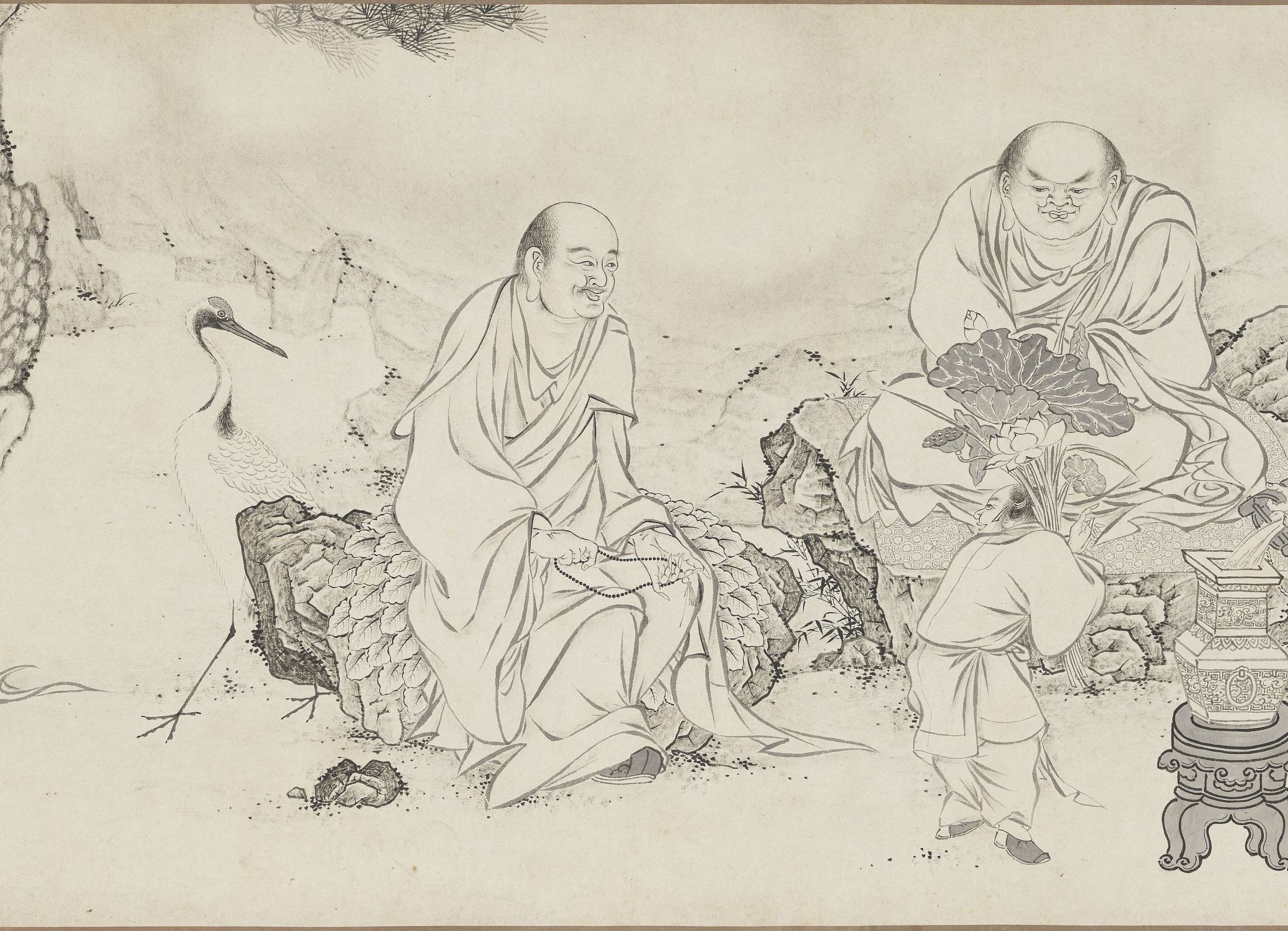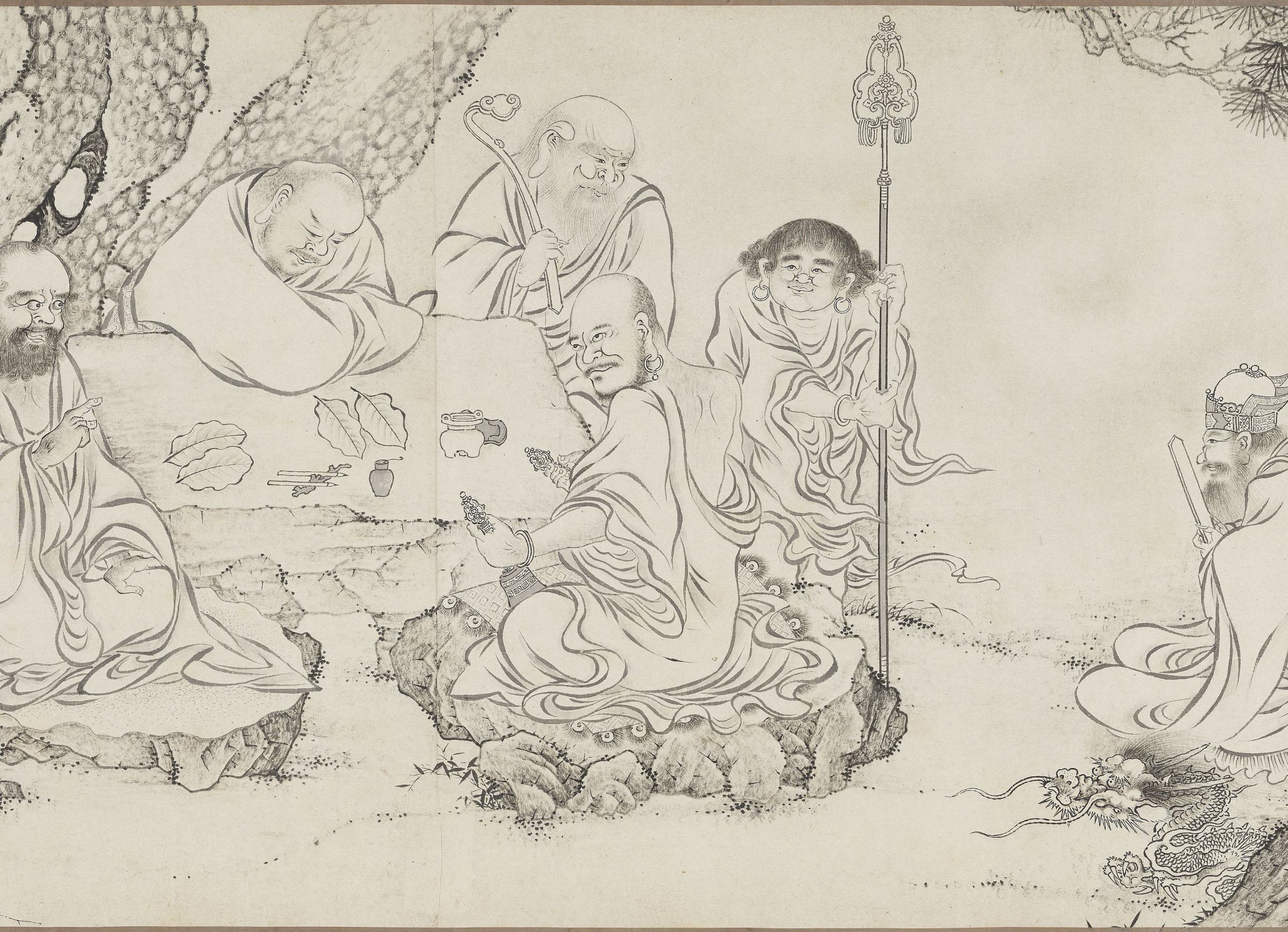 /0 评论/分类 元代, 绘画, 艺术类 /撰自 未曾此《百佛来朝图》卷旧传为北宋李公麟绘。画卷描绘(白描)了十六罗汉游憩于山林之中的场景,罗汉们姿态各异,神情生动,或坐或立,或论道或静修。罗汉左右有天王、侍者护法,并有龙、虎、猿、鹤、鹿等祥禽瑞兽相伴左右。此卷现藏于台北故宫博物院。