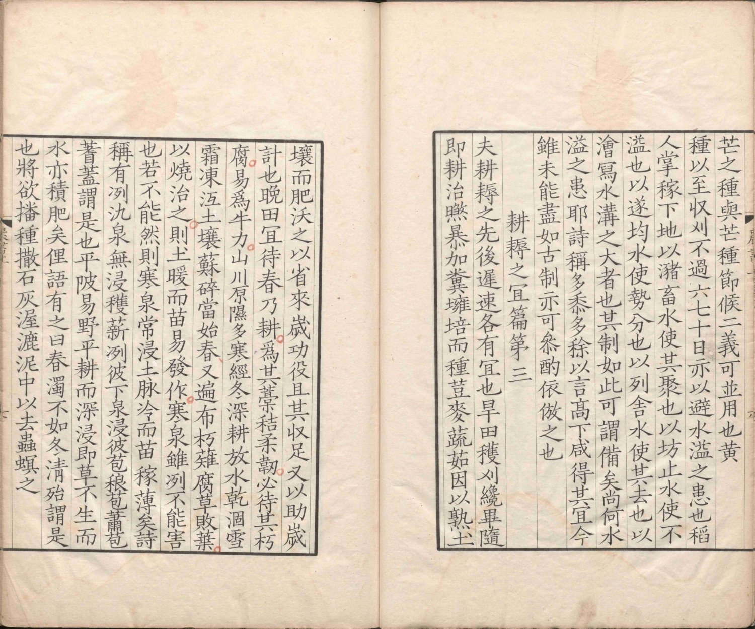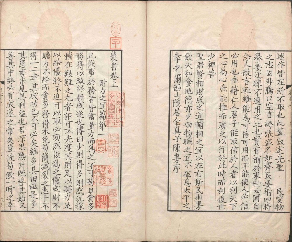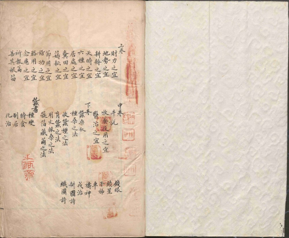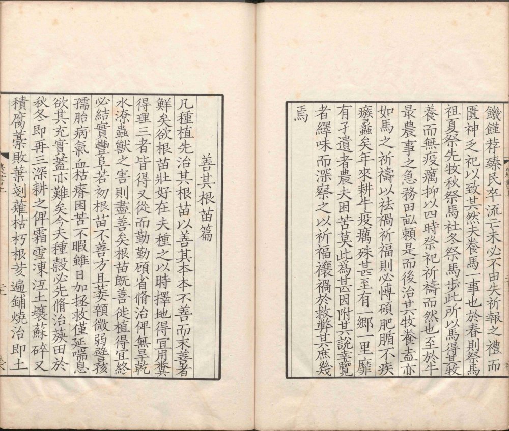 农书卷上:财力之宜篇第一、地势之宜篇第二、耕耨之宜篇第三、天时之宜篇第四、六种之宜篇第五、居处之宜篇第六、粪田之宜篇第七、薅耘之宜篇第八、节用之宜篇第九、稽功之宜篇第十、器用之宜篇第十一、念虑之宜篇第十二、祈报篇、善其根苗篇
