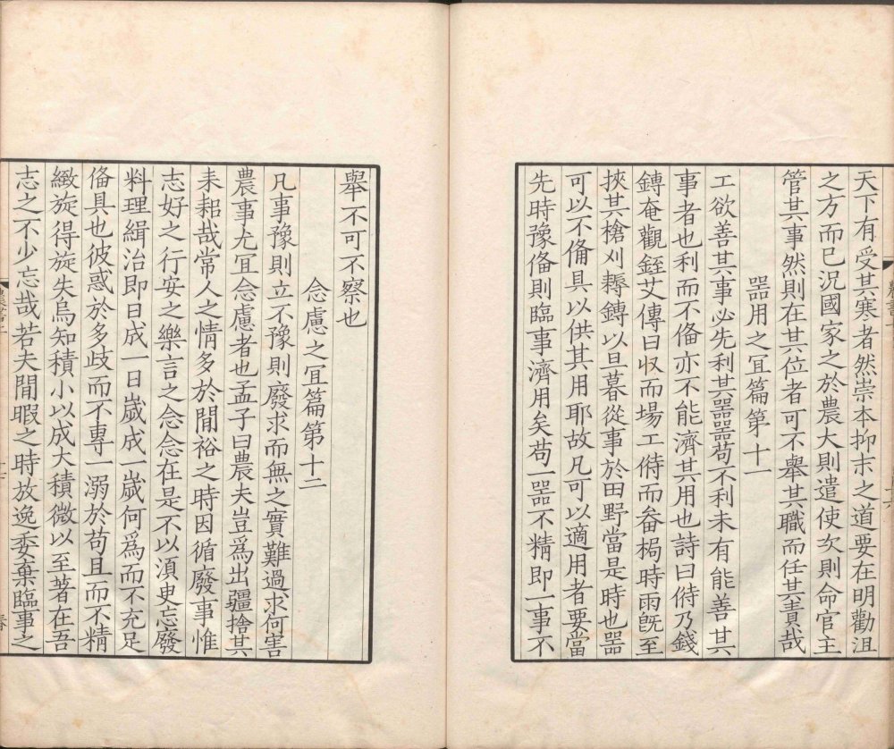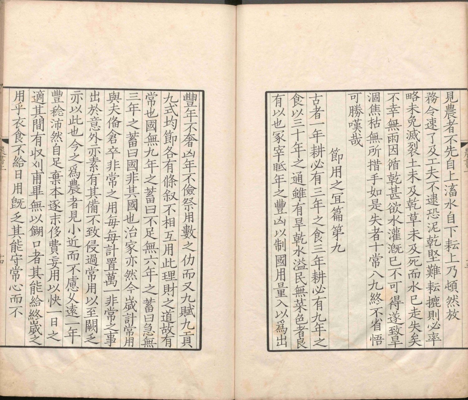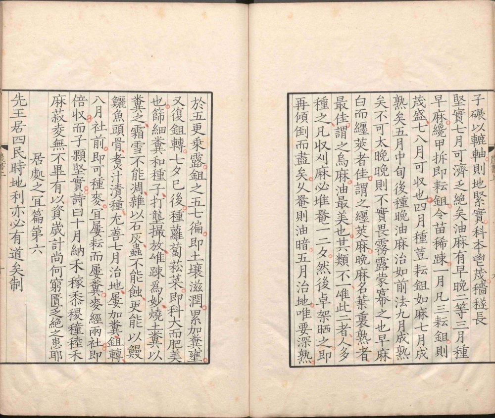 农书卷上:财力之宜篇第一、地势之宜篇第二、耕耨之宜篇第三、天时之宜篇第四、六种之宜篇第五、居处之宜篇第六、粪田之宜篇第七、薅耘之宜篇第八、节用之宜篇第九、稽功之宜篇第十、器用之宜篇第十一、念虑之宜篇第十二、祈报篇、善其根苗篇