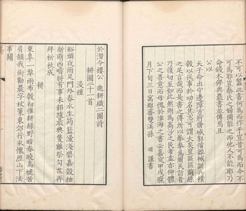 《於潜令楼公进耕织二图诗》是南宋诗人、官吏楼璹(音:shú)所作的作品,旨在翔实记录农耕与蚕织过程。全书分《耕图》二十一首和《织图》二十四首,详述从浸种、耕作到入仓,以及浴蚕、剪帛的细致流程。