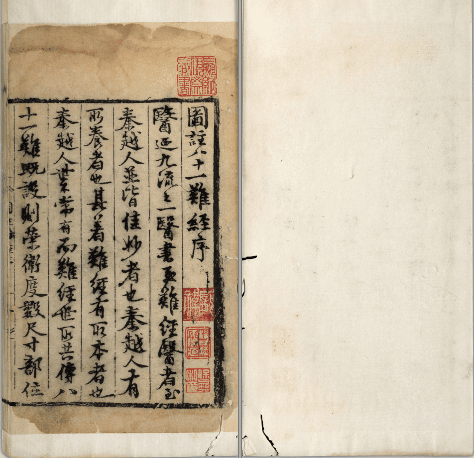 首明正德五年(1510)徐昂序,云四明張君世賢,於醫學有心領神會,診視病人,用藥如神,曾為《難經》作注,注後附圖,兩淮鹽運使呂君邦佑,珍重其人,乃為之鋟梓以傳。此本為楊氏海原閣舊藏,卷二首葉殘缺。