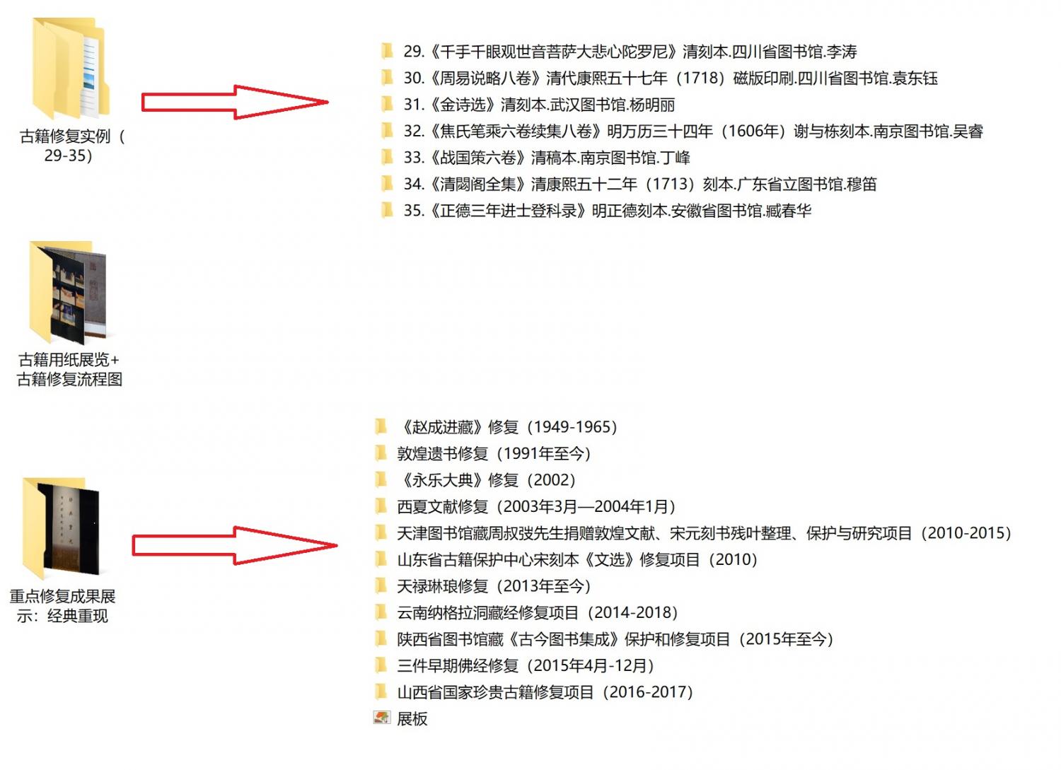 荒原狼游客未曾老师:您好,首先感谢您和书格网为广大书友提供了绝佳的古籍资源。近日,本人去抽空去国图参观了古籍修复成果的展览,特意拍摄了一些修复实例的图片,因参观时间有限,拍摄的照片较少,目前仅整理出28本实物的照片资源,详见下图。资源中每本书单列一个文件夹,文件名按照展览实物所示,标注了书名、刊刻或抄写年代、馆藏地、修复师等,文件夹内含6000*4000像素的照片若干,另有一个文件夹是一些展馆内的介绍性文字资料。若有无法亲赴此展的书友,可从下面的链接自行下载阅览。