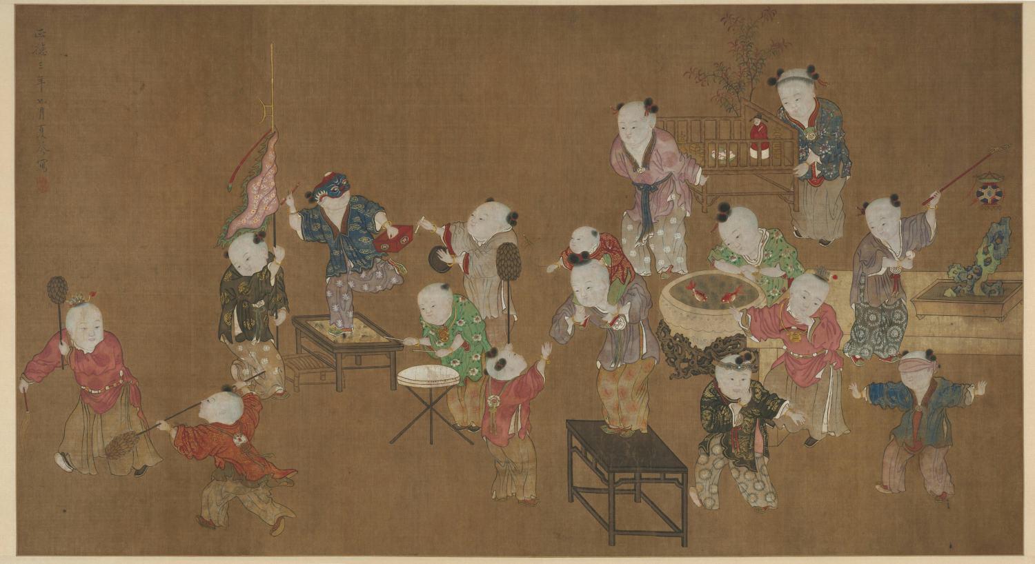 明代夏葵绘(存疑)。婴戏图是描绘儿童游戏时的画作,又称 “戏婴图”,是中国人物画的一种。此卷描绘一群正在玩耍的儿童,画面热闹非凡,有敲锣的、打鼓的、捉迷藏的、观赏金鱼的、打灯笼的、习武的、持戟的、扮魁星点斗的……绢本设色,画卷左上题:正德三年七月夏葵寫。