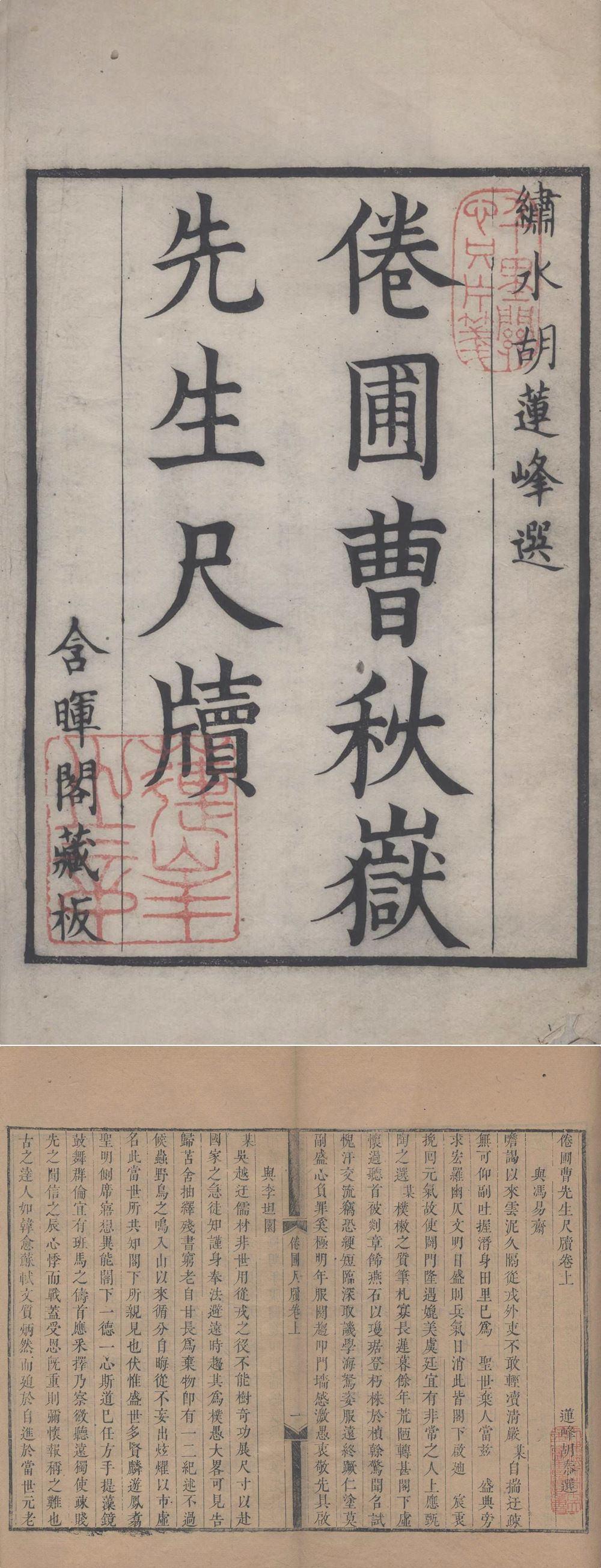倦圃曹先生尺牍.二卷.清.曹溶撰.胡泰选.胡泰辑.清雍正含晖阁刻本