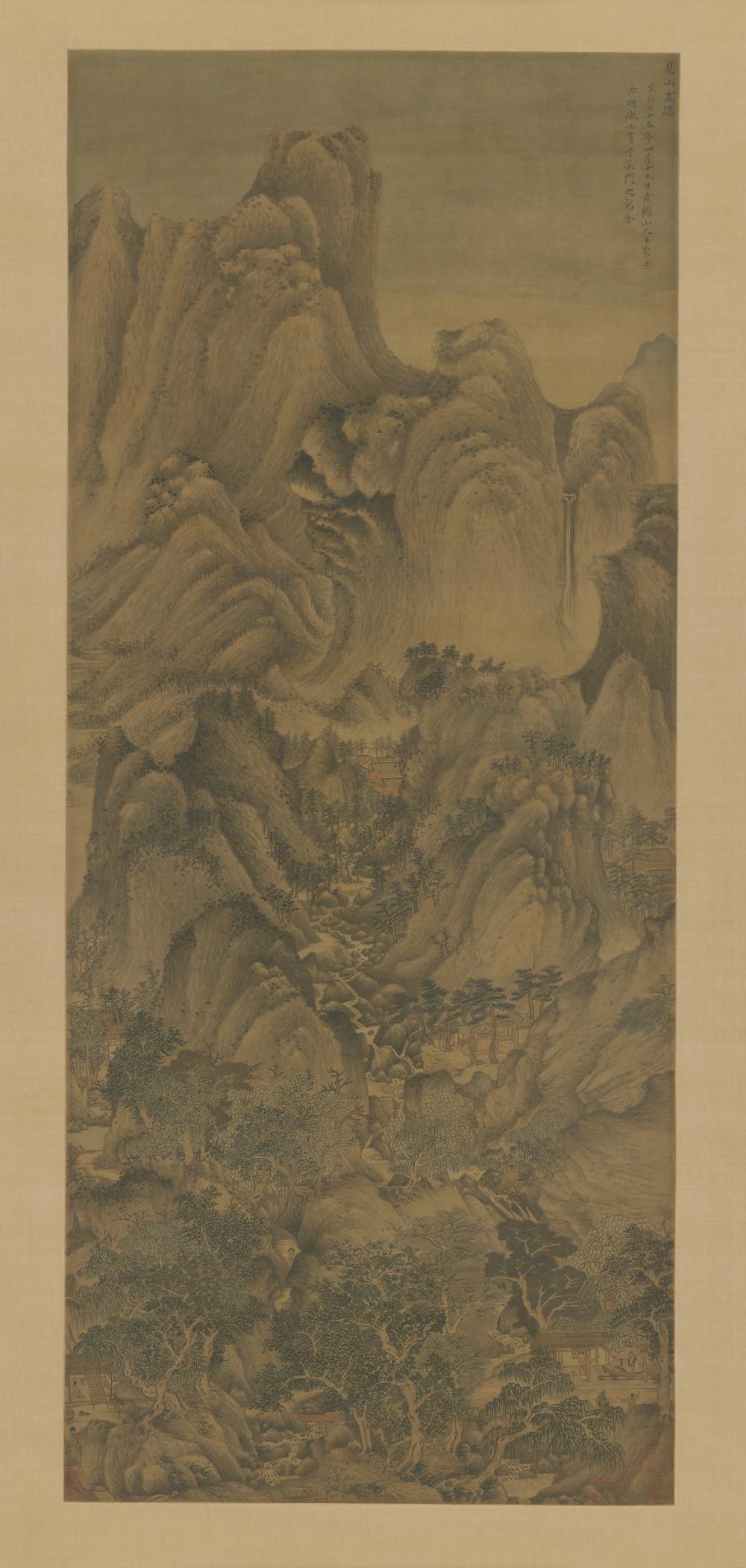 元代王蒙作。此图为彦明征士而作,画重山峻岭,瀑布孤悬。下方房舍两区,右侧屋内高士手持羽扇踞坐榻上,童子捧盘侍奉左右,屋外一童子正在调鹤,庭前草树丛密,山溪流淌,横卧溪上的小桥将两处屋舍连接。左侧屋内一妇人正在劳作,庭中小犬静卧,呈现出一派静谧清幽的意境。林间小路上,一着官服之人捧敕而来,似征召高士的使者,抑或是奉敕祭山的官员。中部山路曲折,溪水潺潺,观舍隐现于松荫林木之间。上部山峦叠起,瀑布飞泻。右上自题:夏山高隐,至正二十五年四月十七日,黄鹤山人王蒙为彦明征士画于吴门之寓舍。此幅现藏于北京故宫博物院,绢本设色。