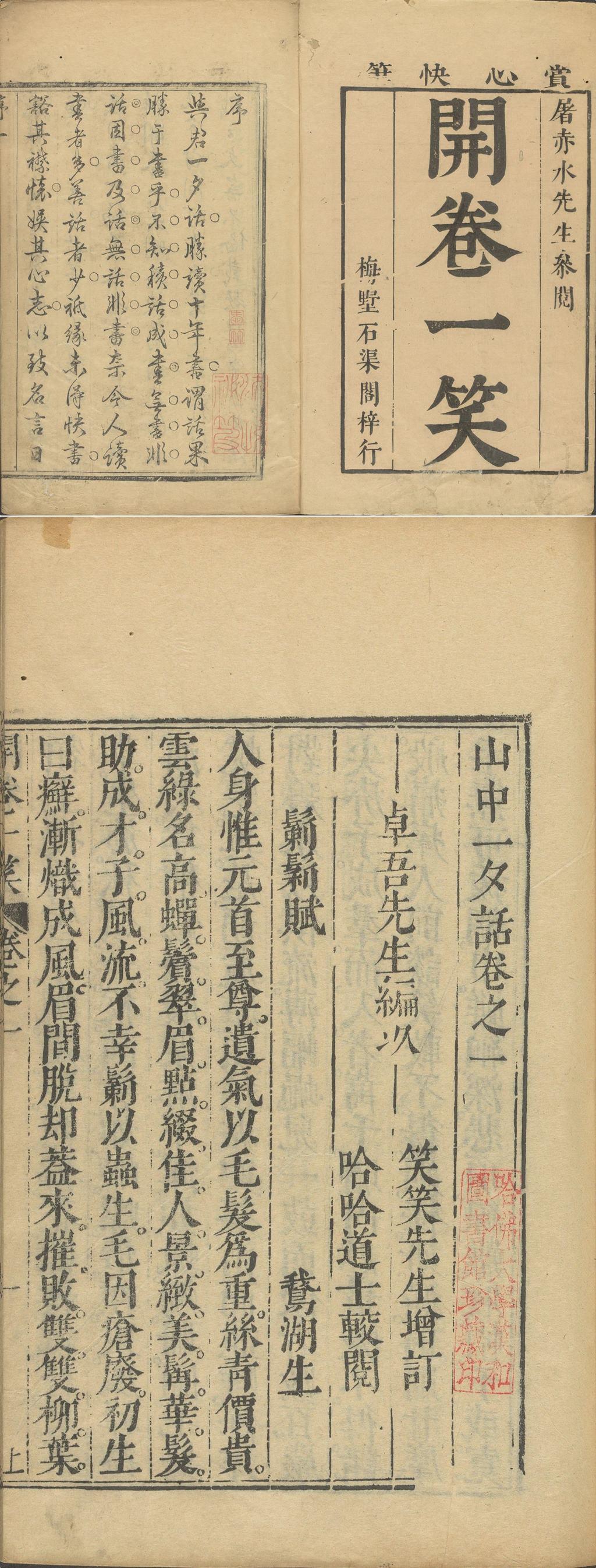 山中一夕话.开卷一笑.上集.下集各七卷.明.李贽编.笑笑先生增订.明末梅墅石渠阁刊.清补版印本