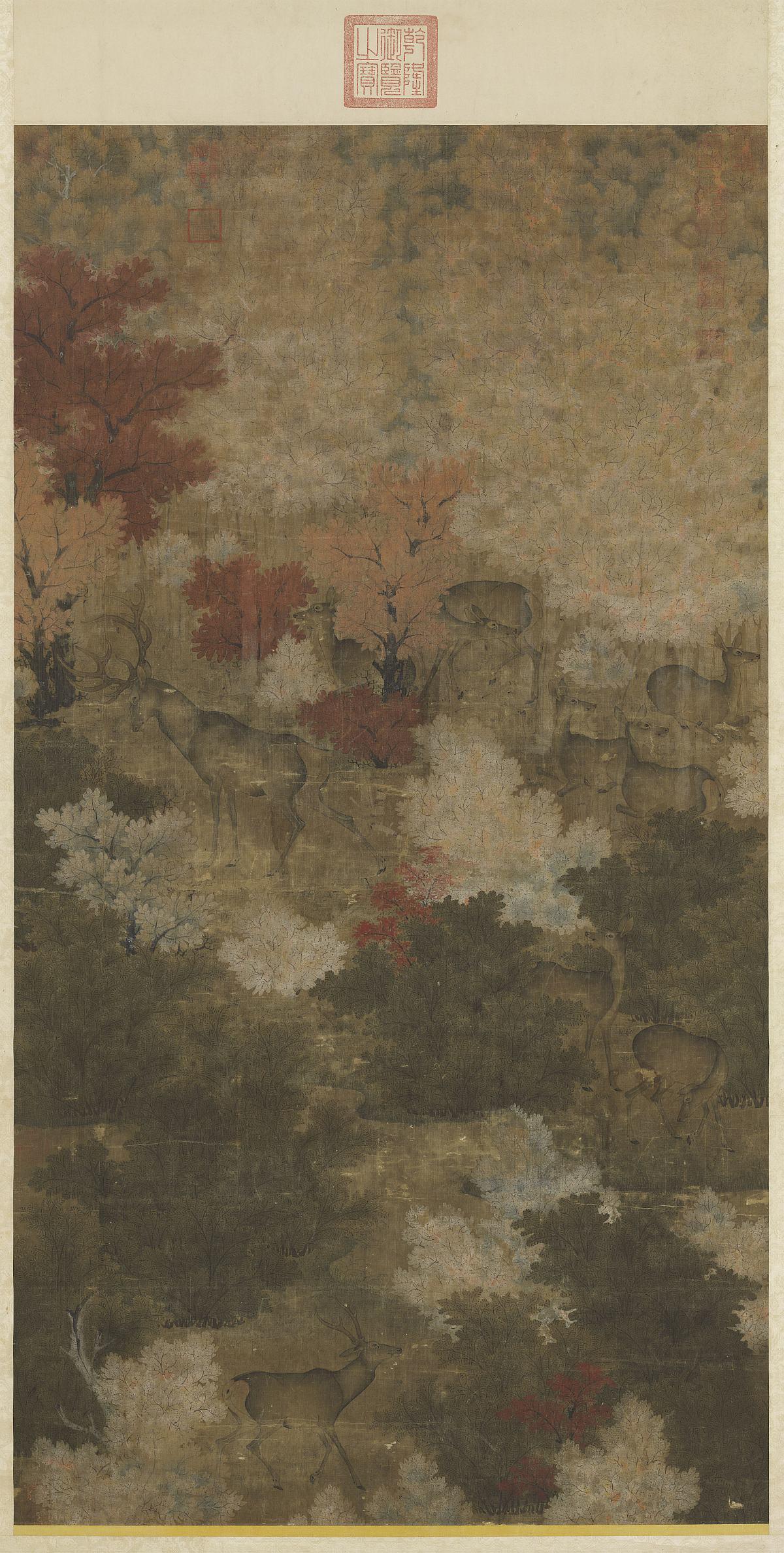 此画无作者名款(五代十国),画秋日枫林中,群鹿嬉游憩息情景。画法极奇,异于一般传统方法,似受外来影响,具有浓厚装饰趣味。画鹿全以淡墨分染,画树叶先用细笔钩轮廓与脉络,再用汁绿渍染,或用粉填,然后淡罩彩色,彩不掩墨,自有光彩浮动,生意荣茂之色。通幅予人精致柔丽感觉。《图画见闻志》载宋仁宗时,辽献千角鹿图,本幅或与此有关。此幅现藏于台北故宫博物院。