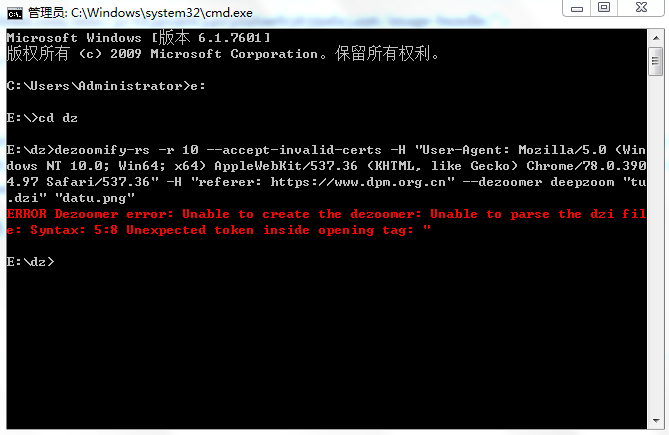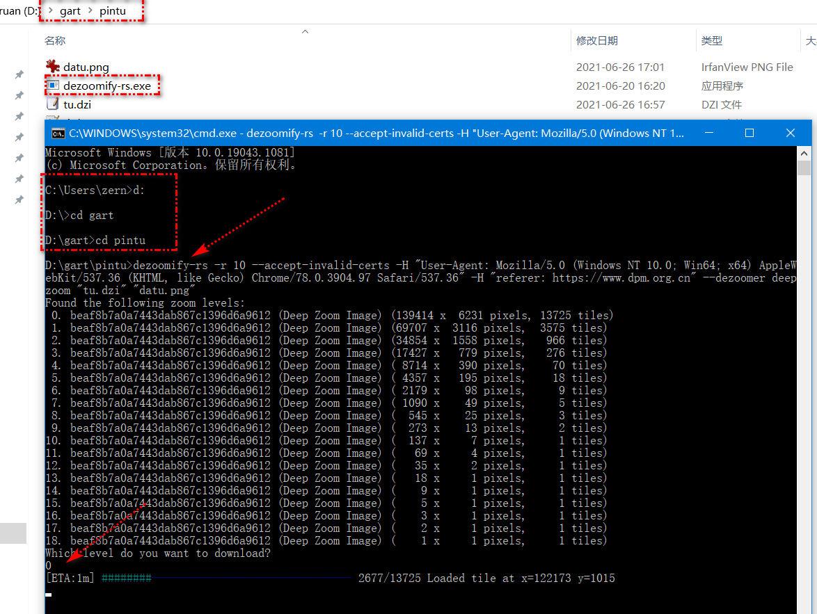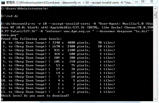 然后通过cdm运行dezoomify-rs -r 10 --accept-invalid-certs -H "User-Agent: Mozilla/5.0 (Windows NT 10.0; Win64; x64) AppleWebKit/537.36 (KHTML, like Gecko) Chrome/78.0.3904.97 Safari/537.36" -H "referer: www.dpm.org.cn " --dezoomer deepzoom "tu.dzi" "datu.png"