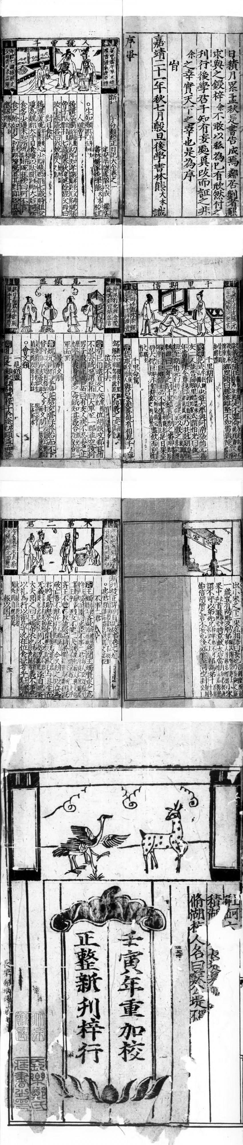 《新刊大字分類校正日記大全》九卷,明嘉靖二十一年(1542 年)刊,建安虞韶作,卷首题:“新刊大字分类校正日记大全”,“建安草窗虞韶以成纂集,书林鳌峰后学熊大木校注”,版式为上图下文,半叶十四行,行十九字,黑口,四周双边。《日记故事》此前已在建阳书坊多次刊行,熊大木作为私塾先生时便因此书的错误而不断删改,并对疑难问题进行注释,最后付书林刘氏书坊刊行。此后,《日记故事》被不断重刊,熊大木校本为现存最早刊本。(@16152)