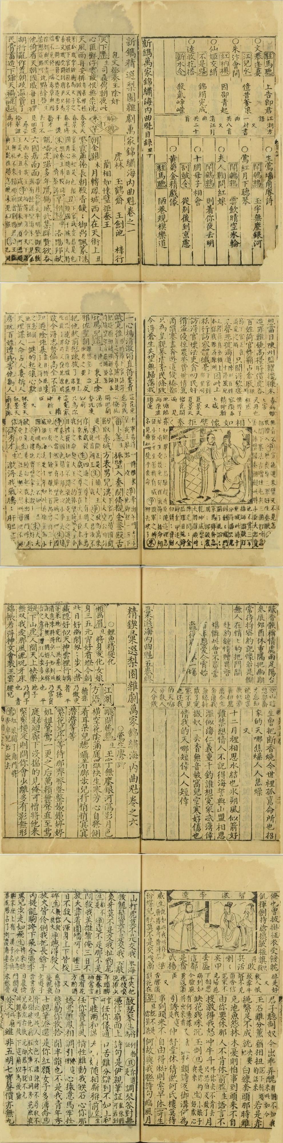 《新镌精选梨园杂剧万家锦绣海内曲魁》,为明代戏曲家王錂编刊的戏曲、俗曲选辑。“半页三栏,上栏十二行,行十字,曲白同行,有插图;下栏十一行,行十五字,曲白同行,亦有插图。中栏不分行,收录时兴小曲及江湖方语”,据考证此本或为万历年间刻本,但一直未见诸家著录,疑为海内孤本,对“了解文人的戏曲趣味,探讨明清戏曲发展轨迹,均有一定的价值和意义”。(介绍参考)
