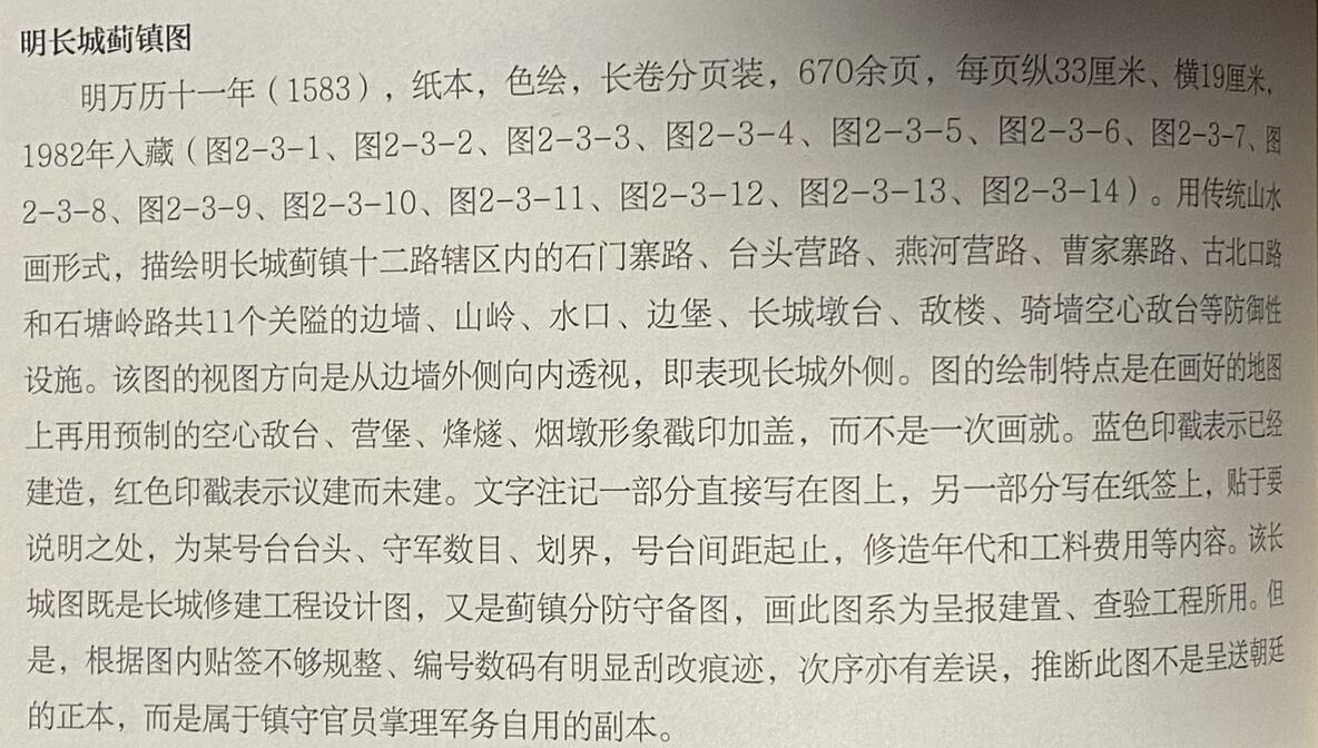 明万历十一年(1583),纸本,色绘,长卷分页装,670余页,每页纵33厘米、横19厘米1982年入藏(图2-3-1、图2-3-2、图2-3-3、图2-3-4、图2-3-5、图2-3-6、图2-3-7、图2-3-8、图2-3-9、图2-3-10、图2-3-11、图2-3-12、图2-3-13、图2-3-14)。用传统山冰画形式,描绘明长城蓟镇十ニ路辖区内的石门寨路、台头营路、燕河营路、曹家寨路、古北口路和石塘岭路共11个关隘的边墙、山岭、水口、边堡、长城墩合、敌楼、骑墙空心歌台等防御性设施。该图的视图方向是从边墙外侧向内透视,即表现长城外侧。图的绘制特点是在画好的地图上再用预制的空心敌台、营堡、烽燧、烟墩形象戳印加盖,而不是一次画就。蓝色印表示已经建造,红色印戳表示议建而未建。文字注记一部分直接写在图上,另一部分写在纸签上,贴于接说明之处,为某号台台头、守军数目、划界,号台间距起止,修造年代和工料费用等内容。城图既是长城修建工程设计图,又是蓟镇分防守备图,画此图系为呈报建置、查验工程所用。是,根据图内贴签不够规整、编号数码有明显刮改痕迹,次序亦有差误,推断此图不是呈送朝延的正本,而是属于镇守官员掌理军务自用的副本。