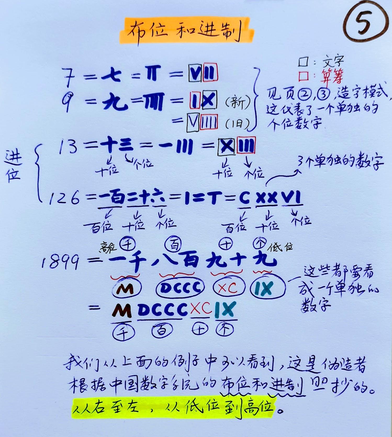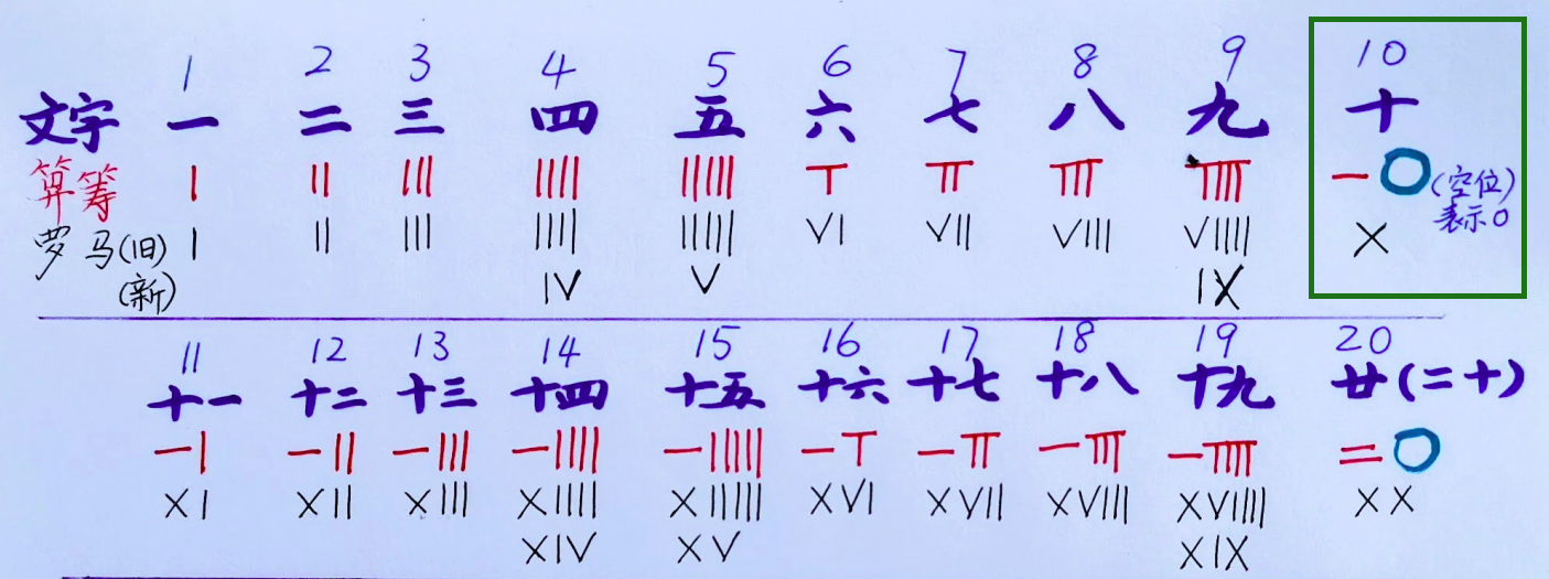 剩下的问题都没啥难度了,例如罗马数字系统里,四是用五减一表示,九是用十减一表示,这是还多少有点令人费解;其他的,都是和算筹表示的思路一模一样。