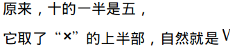 朋友所言极是。然而由于西方伪造罗马数字系统的时候先造了“十”,旋转45度之后对应拉丁字母“X”,所以,回过头来改进“五”的时候,发现“X”已经被占用了。因此顺理成章地使用了字母“V”,因为这个“V”正好是“X”的上半部分,可以表示“十”的一半,五。