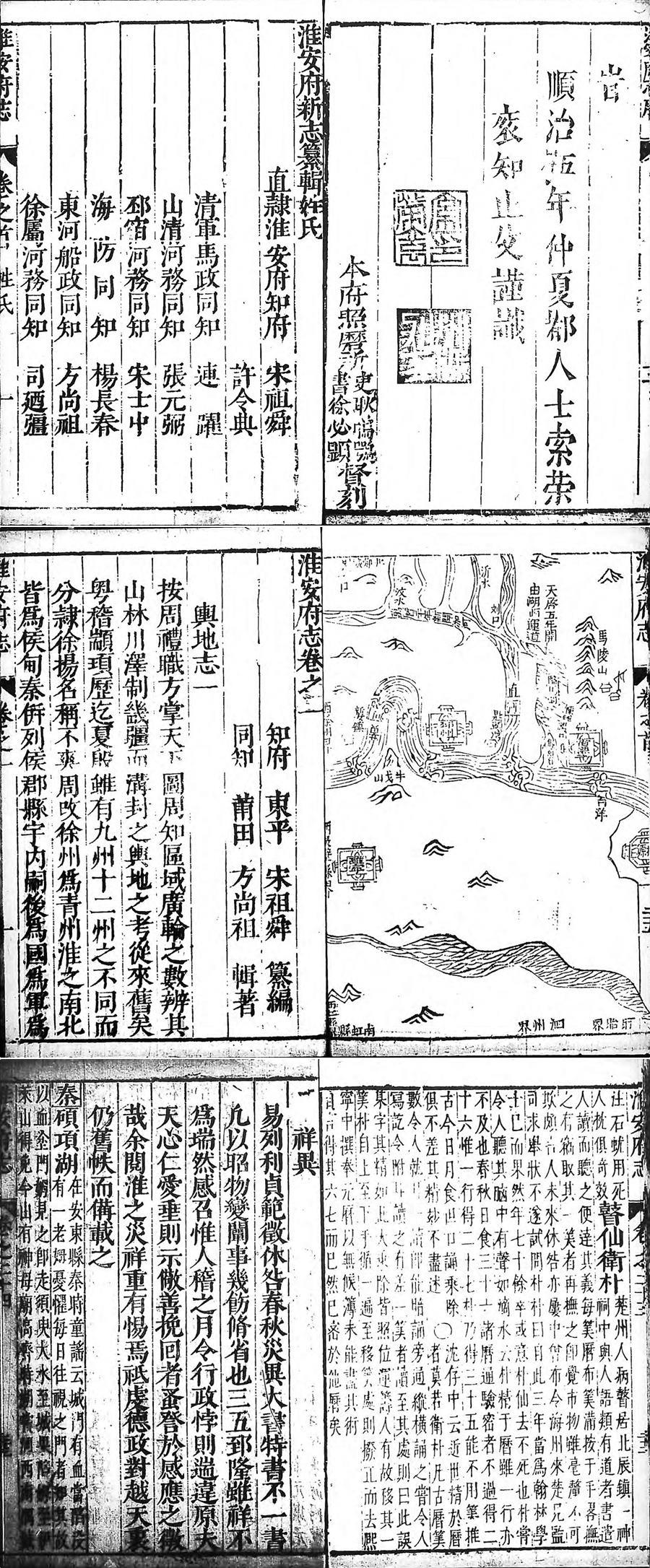 祖舜,山东东平人。明万历44年(1616)进士。天启3年任淮安知府,升陕西兵备副使。尚祖,福建莆田人。举人。明天启2年任东河船政同知,崇祯元年(1628)升任应天府知官。该志纂修姓氏后记有“天启6年丙寅五月端午吉旦竣梓。”但卷14《选举志·举人》记事却止于崇祯2年,说明崇祯间有人增修过。又志首有清顺治5年淮安知府索荣衮《重修淮安府志序》,故定为明天启6年刻清顺治5年递修本。原本藏台湾,稀世罕见。全书分为12志,首为淮安府舆地图说,图凡18幅。卷1~2舆地志:星野、疆域、沿革、形胜、山川、风俗、物产;卷3建置志:城池、公署、驿铺;卷4~7秩官志:历代建官、皇朝宪台、漕运总兵、部使、府官、州县官、学官、名宦、宦绩、武绩;卷8学校志:儒学、礼学、书院;卷9典礼志:坛庙、秩礼、祠宇;卷10兵戎志:武署、卫所、兵营;卷11~12贡赋志:户口、田粮、征差、条鞭、杂征、课程、部税、今匠、马驿、长大、军饷、钱法、盐课、壮勇、关兵;卷13河防志:河源、分漕、堤堰、防守;卷14《选举志》:科贡、荐辟、武科、例监、勋爵、封荫、杂阶;卷15~18人物志:仕迹、列将、忠烈、孝义、儒林、文苑、隐逸、列女、侨寓;卷19~22艺文志:文目,疏议、序记、诗赋;卷23~24丛纪志:古迹、寺观、丘墓、仙释、方技、祥异、瘅恶、丛谈。是志破天章、宸翰冠首的旧例,将御制文收入《艺文》,较为合理。《凡例》记述了淮安府修志源流,为研究府志原委提供了有用资料。《西游记》的作者,向有争议。卷19《艺文·淮安文目》吴承恩条目下记“《射阳集》、《春秋列传》、《西游记》。”这对研究吴承恩与《西游记》有较高的资料价值。但全志内容记载较零乱,类目统属不清,讹误不少。