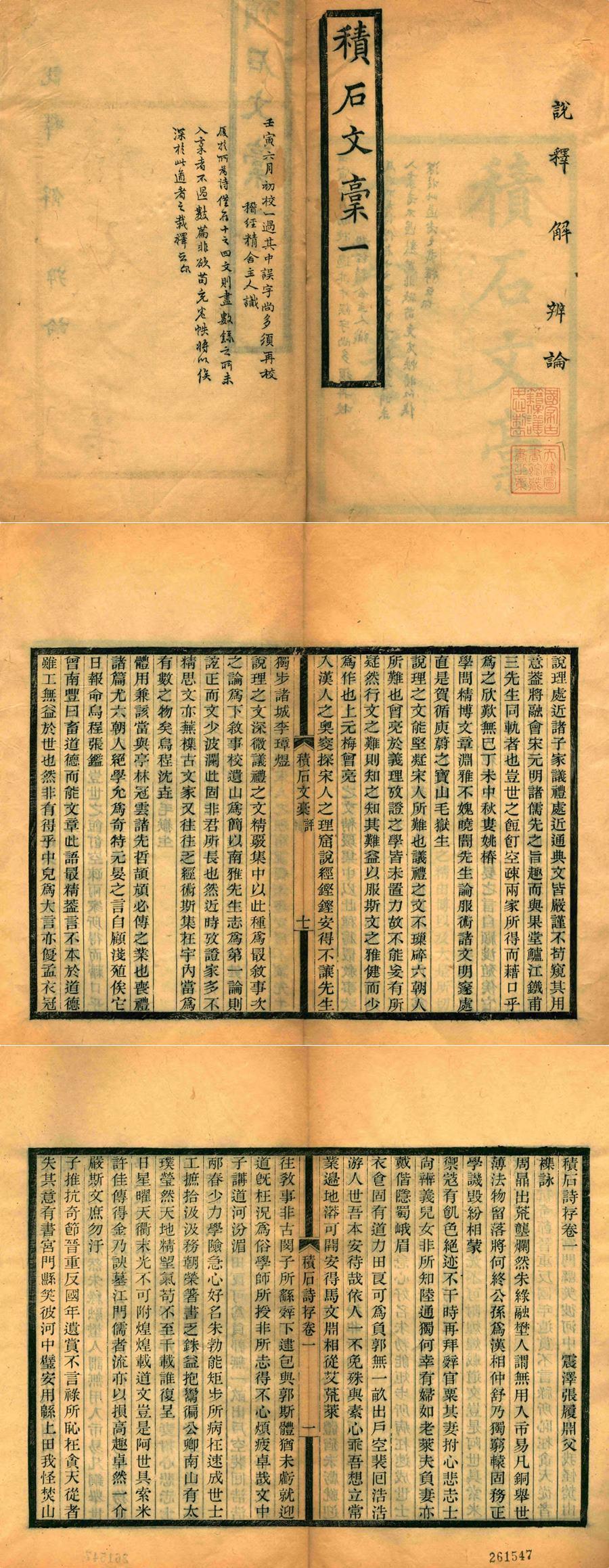 晚霁游客张履(1792-1851)撰。张履,字渊甫,初名生洲,江苏震泽(今吴县)人。嘉庆举人,以教习注知县投牒,改教谕。其人自少志圣贤之学,尤精三礼,博考诸家,而主于治经穷理。著有《宗法通考》、《丧礼辨误》、《容山教事录》、《课经偶记》、《炳烛记》等。《积石文稿》系作者自定稿卷,多属考订之文,也有书札、行状、碑铭之类。《积石文稿》为光绪二十年(1894)刻本,其后有民国十七年(1928)重刻本。