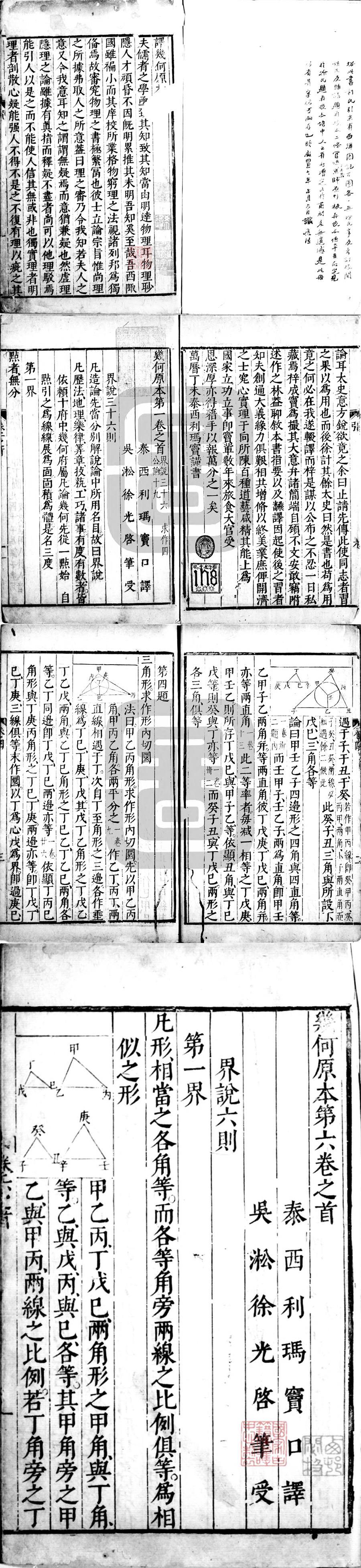 九靈游客《几何原本》,明万历三十五年(西元1607年)初刻本,6卷。此初刻本具有很高的学术研究价值。