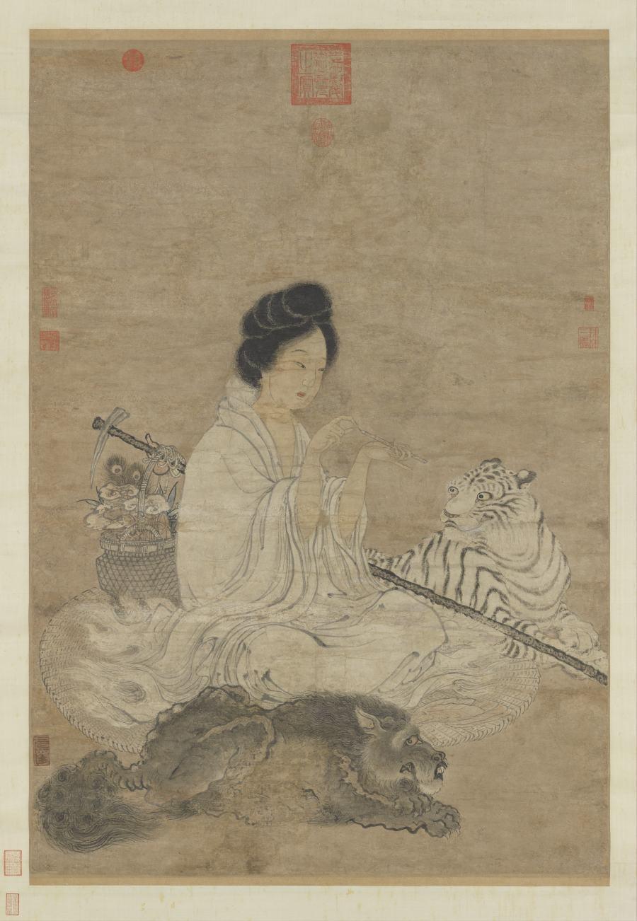 元人绘?。本幅绘女仙高髻素衣,趺坐蒲团,手拈笔毫,膝前置贝多叶,似欲书经传道。旁有筠篮系锄上,中贮芝草。一狮一虎伏侍在侧,状甚温驯,盖表现女仙道高,足以降服猛兽。此幅现藏于台北故宫博物院,纸本设色。