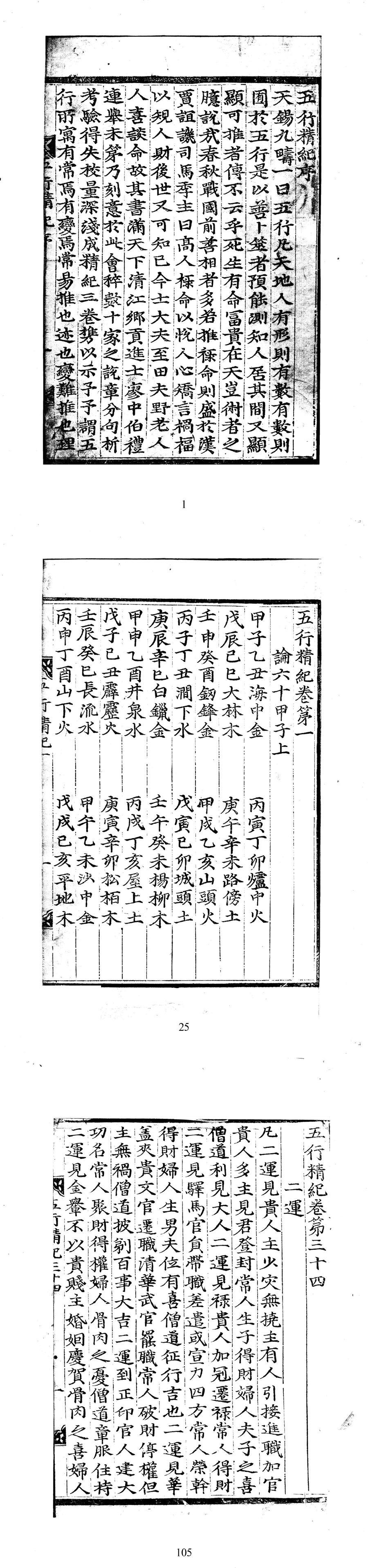 《五行精纪》为宋代的命理学集大成之作,编撰者廖中,是研究古法论命(虚中法)的重要典籍。宋以来的多个书目载有此书,如 [南宋] 陈振孙《直斋书录解题》:“《五行精纪》三十四卷。清江乡贡进士廖中撰,周益公为之序,集诸家三命说。”[明] 杨士奇《文渊阁书目》:“《五行精纪》一部一册。”[清] 钱曾《读书敏求记》:“《五行精纪》三十二卷。此书钞写精妙,又经旧人勘对过,洵为善本无疑,所引书五十一种,余所有者惟《珞琭子》,他则俱未之见,抚书自惭,何敢与收藏家相埒乎。”[清] 瞿镛《铁琴铜剑楼藏书目录》:“《五行精纪》三十三卷(旧钞本),宋廖中撰。此书《书录解题》及《文献通考》作三十四卷,《敏求记》所载只三十二卷,缺三十三、三十四两卷也,此较多一卷。所引星命家五十一种,多不经见者。”