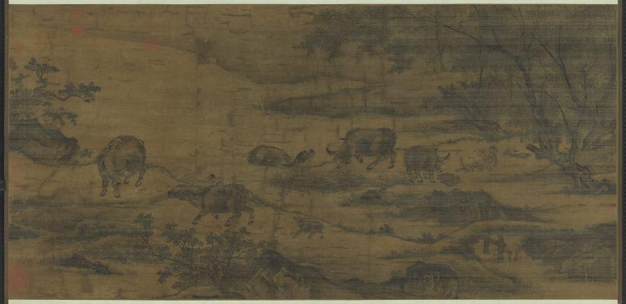 传宋人绘。此图描绘溪岸边河汊纵横,树荫下丰原茂草,正是放牧的好场所。牛群大小共六头,三个牧童发生了争执,正在相打。另外两个牧童,却在牛背上,悠闲地对话。笔力粗壮,墨色浓重,图上无款印,时代为后人所定。此幅现藏于台北故宫博物院,绢本水墨。