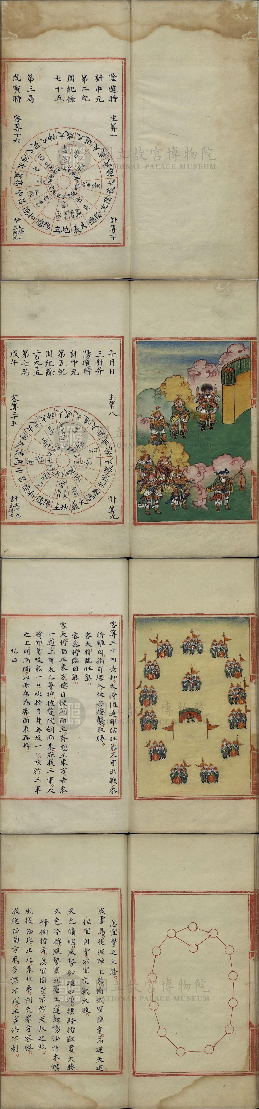 明内府鈔本 [八行十八字 (21.9×13.5)] 不詳撰人姓氏。按《易緯乾鑿度》下云:“太一取其數以行九宮”,玄注:“太一者,北辰之神名也。神所居,故亦名之曰宮。天一下行,猶天子出巡狩,省方岳之事,每率則復。太一下行八卦之宮,每四乃還於中央,中央者北神之所居,故因謂之九宮。” 此爲後世太乙、九宮、遁甲之說所從出。是書僅存十六册,不知原卷若干,蓋有陰遁、陽遁适各七十二局。按《存目》卷百十有《太乙成書> 八卷,其内容似大致與是書相同,《成書》凡五周,爲三百六十局,疑是書亦應有三百六十局也。