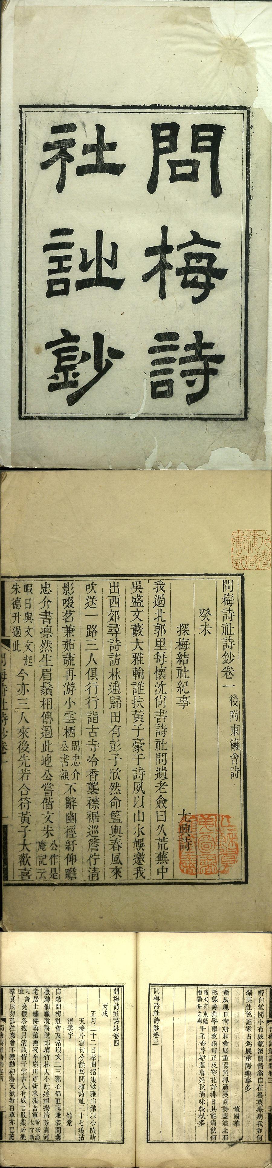 问梅诗社是清代中晚期苏州地区十分有影响力的文学社团,最初由著名学者诗人黄丕烈、尤兴诗、彭希郑发起,并邀请石韫玉参加,以后相继有知名文士加入。社集诗歌刊刻为《问梅诗社诗钞》以广流传,但因战乱,目前国内仅南京图书馆、复旦大学图书馆和中国科学院图书馆有庋藏。南京图书馆藏本共四卷,分装二册。