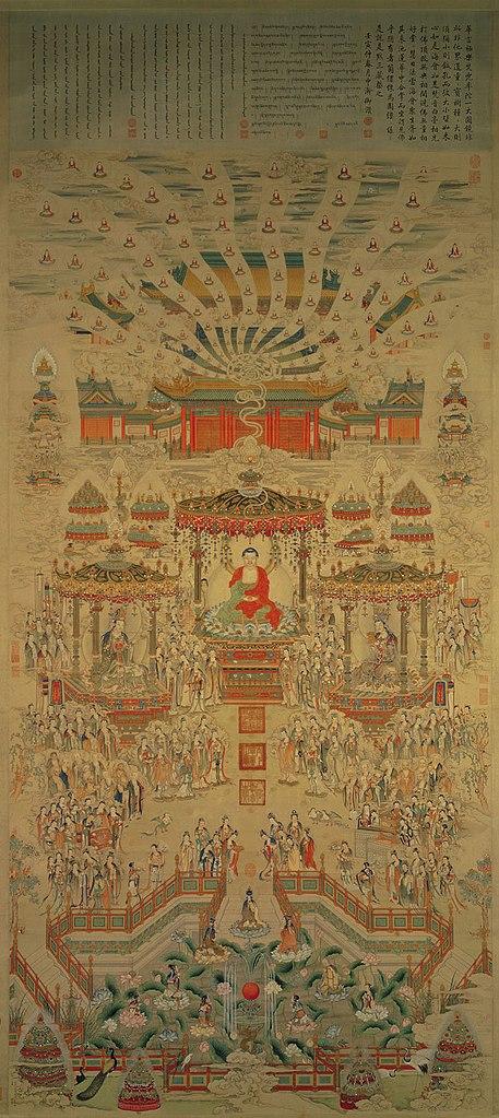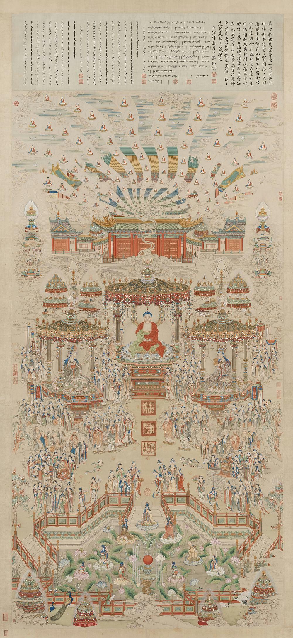 未曾管理员极乐世界图轴.清丁观鹏绘.清乾隆二十四年.纸本设色描金.6636x14429像素