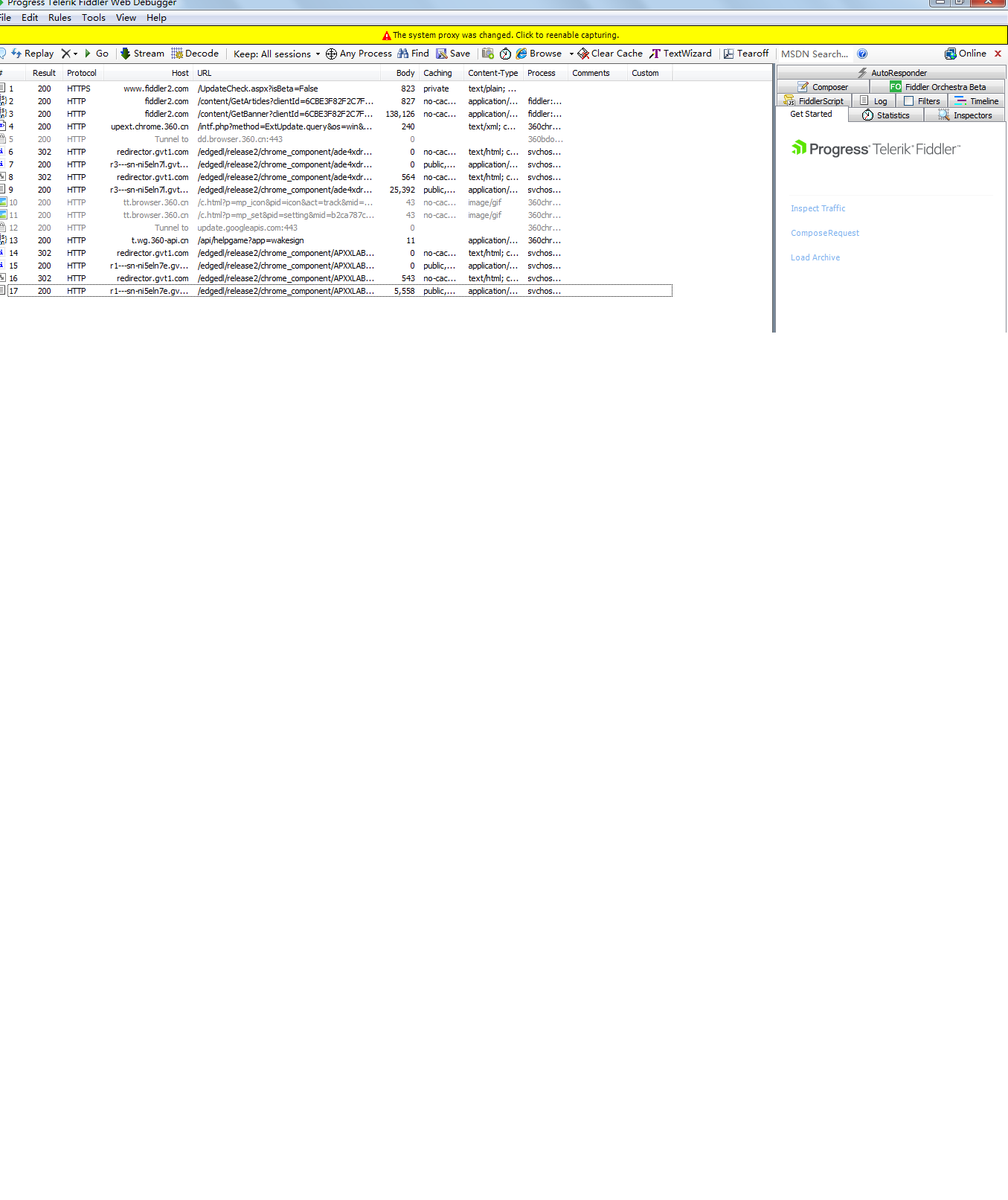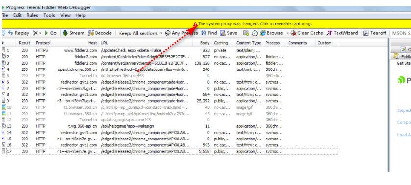 大邱游客用的是Fiddler和360极速浏览器,打开Fiddler后,里面看不到/menhu/开头的URL,而且Fiddler上面还有一行黄色的字,不知道是什么原因,请大家帮忙,谢谢啦