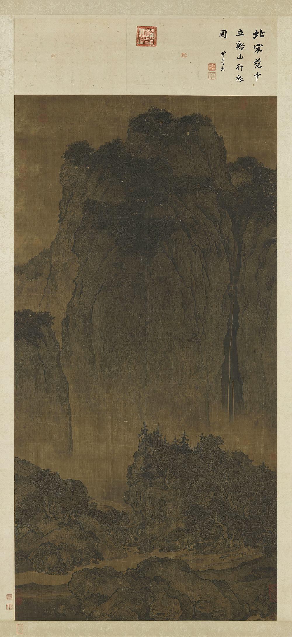 北宋范宽绘。本幅绘巍峨的高山顶立,山头灌木丛生,结成密林,状若覃菌,两侧有扈从似的高山簇拥著。树林中有楼观微露,小丘与岩石间一群驮队正匆匆赶路。细如弦丝的瀑布直泄而下,溪声在山谷间回荡,景物的描写极为雄壮逼真。全幅山石以密如雨点的墨痕和锯齿般的岩石皴纹,刻画出山石浑厚苍劲之感。画幅右角树阴有「范寬」二字款。此幅现藏于台北故宫博物院,绢本浅设色。范宽向来被视为山水成立期的大师,可惜生平不详,只知他曾隐居终南、太华,晚年来往于开封、洛阳间,但未入朝任职,大约1025年时还在世。本幅被公认为他的真迹,甚至视为宋代山水画的代表形象。 画中山水并非模仿真实空间为目标,而是巧妙地在近、中、远三段式的基本构图中,藉推远主山、拉近中景、突显近景渺小行旅与主山巍峨崇高的对比等手法,创造了一种如临其境的壮硕山水之趣。 画幅右下角树荫中藏有范寬」二字款,左下脚则有「忠孝之家」印,为钱勰所有,他也是苏轼的朋友。