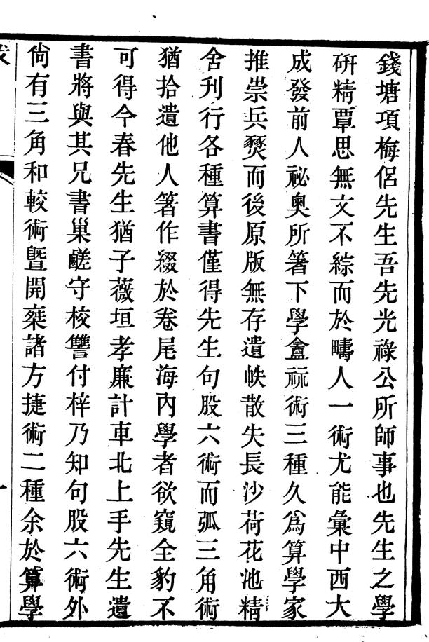 项名达,字梅侣,仁和人。嘉庆二十一年举人,考授国子监学正。道光六年,成进士,改官知县,不就,退而专攻算学。三十年,卒于家,年六十有二。著述甚富,今传世者,但有下学庵句股六术及图解,复附句股形边角相求法三十二题,合为一卷。以句股和较相求诸题术稍繁难,爰取旧术稍为变通。分术为六,使题之相同者通为一术,釐然悉有以御之。第一、二、三术及第四术之前二题,悉本旧解,馀为更定新术,皆别注捷法,各为图解,以明其意。第四、五、六术其原皆出於第三术,可释之以比例。第三术以句弦较比股,若股与句弦和,以股弦较比句,若句与股弦和,是为三率连比例。凡有比例加减之,其和较亦可互相比例。故第四、五、六术诸题,皆可由第三术之题加减而得,即可因第三术之比例而另生比例。因比例以成同积,而诸术开方之所以然遂明。名达又创有弧三角总较术,求椭员弧线术,术定,未有诠释,以义奥趣幽,难猝竟事,故六术独先成云。