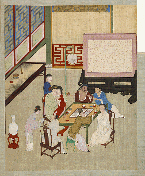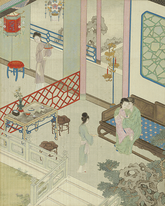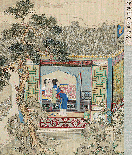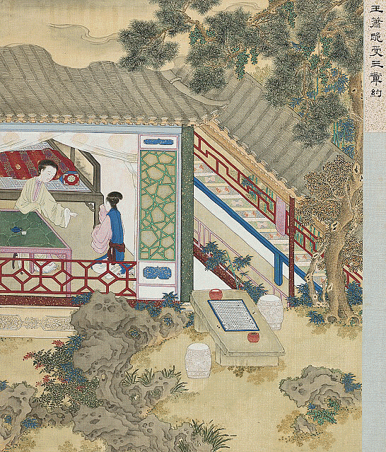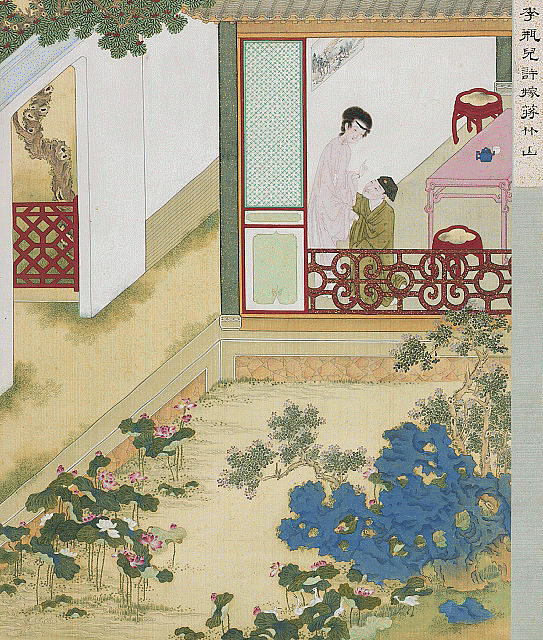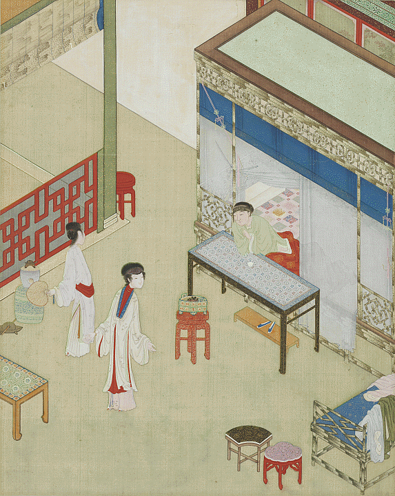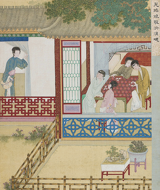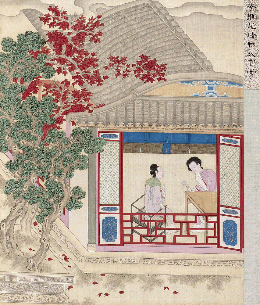 说明:画《百美图》始于明代四大画家之一的仇英,此图册共13张,是明末清初佚名画家所画,从其画法看,明显是受到仇英的影响,主要体现在以线条构图,敷色浓郁,从其服饰来看俱为明代人装束。后来此图册被清宫收藏,足见此图的重要。在明代,画美人图强调的是画美人的外在气质,特别是在文征明等人的提倡下,对审美有极大的提高。