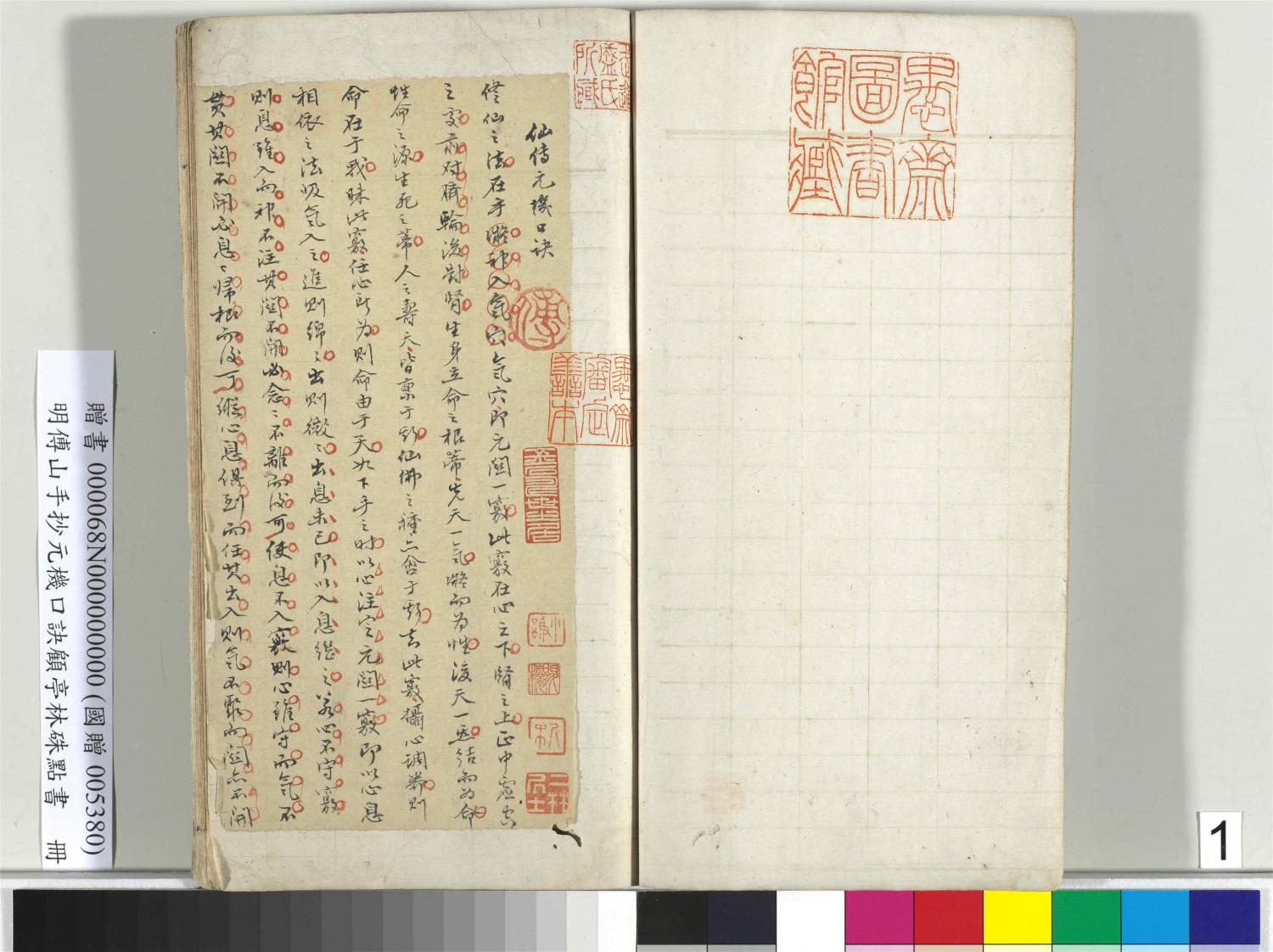 現藏於台北故宮,明代傅山手抄,元機口訣一本,顧炎武硃點書。
