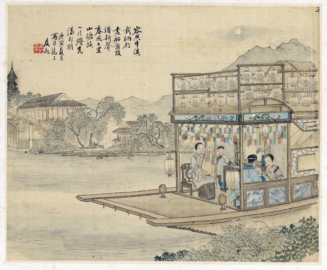 此册画江南仕女生活,有观灯、读书、听琴、登楼等不同场景。