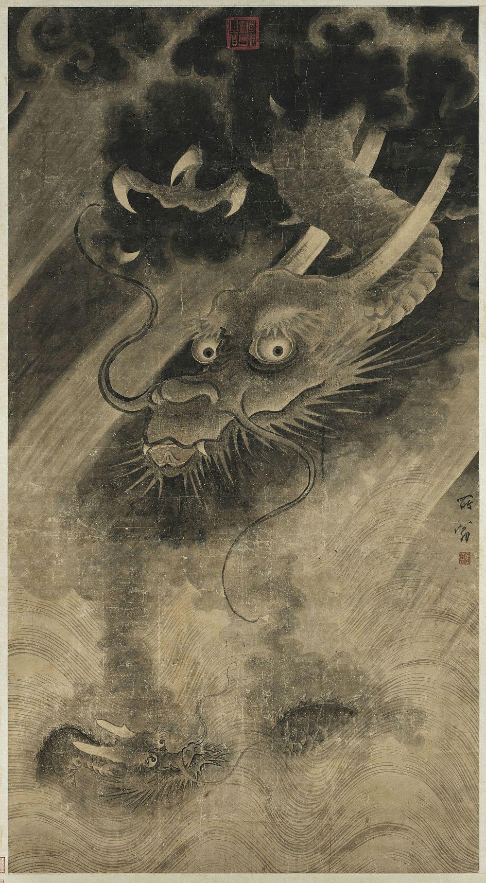 陈容,字公储,号所翁。闽画记作福建长乐人,金谿县志作临川人。南宋理宗端平二年进士,官至莆田太守。善画龙,泼墨成云,噀水成雾,极得变化之意。常于醉馀,脱巾濡墨,信手涂抹,然后以笔完成。所画之龙,或全身,或一臂一首,隐约而不可名状,若不经意而皆能得其神妙。宋理宗宝祐年间,画龙名重一时。此幅现藏于台北故宫博物院,绢本水墨。