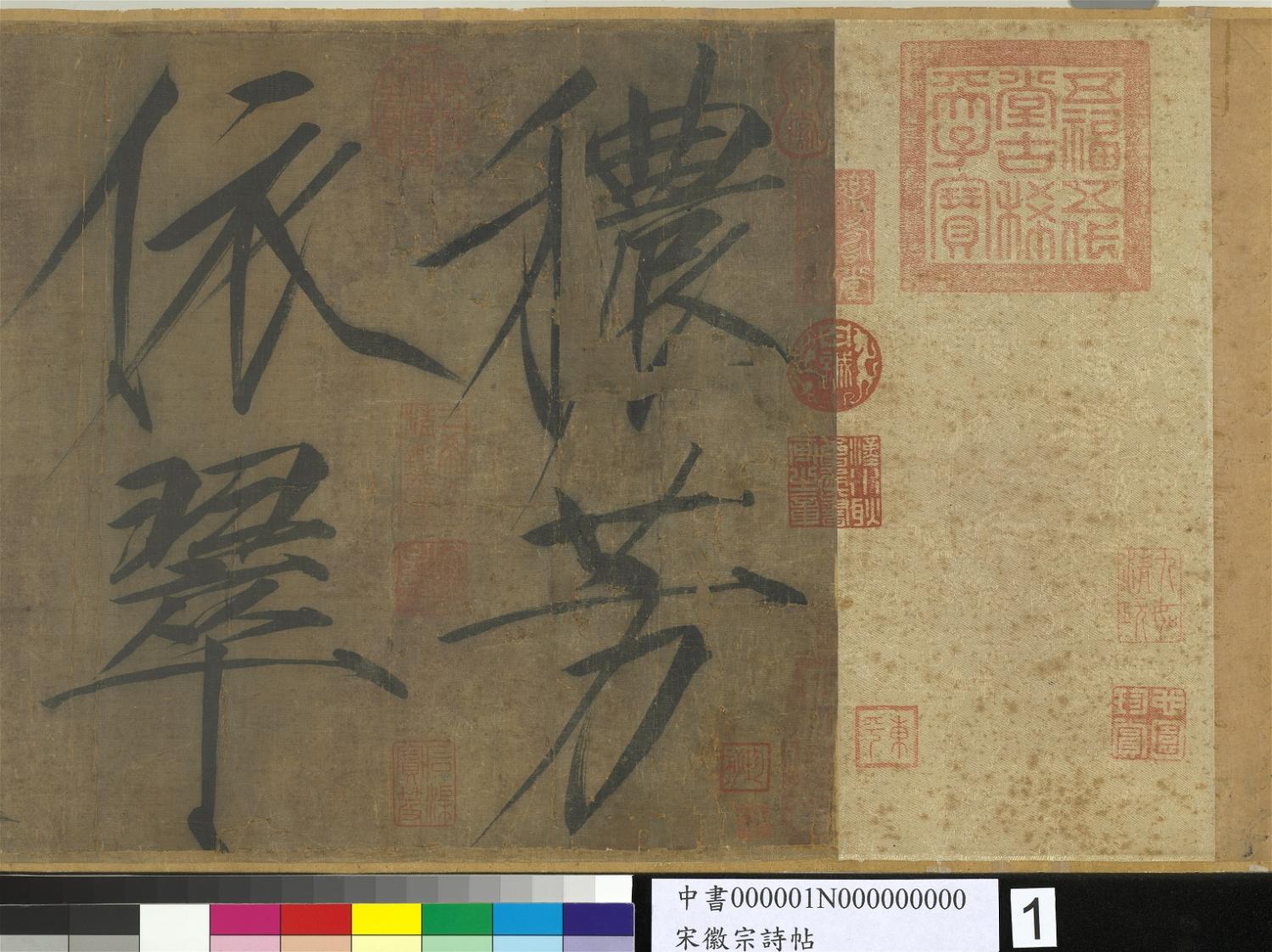 瘦金體大字:「穠芳依翠萼。煥爛一庭中。零露霑如醉。殘霞照似融。丹青難下筆。造化獨留功。舞蝶迷香徑。翩翩逐晚風。」末小字:「宣和殿製」。上鈐朱文「御書」葫蘆印。