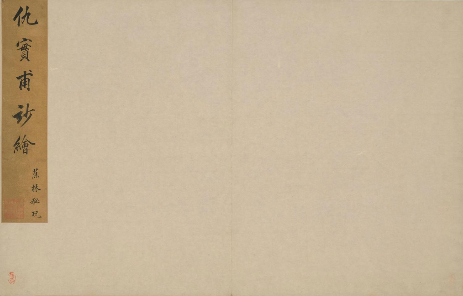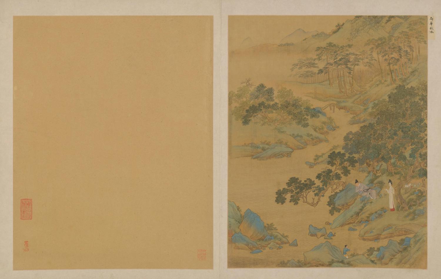 《人物故事图》册,明,仇英作,绢本,设色,每开纵41.4cm,横33.8cm。全册共十开,内容取材于历史故事、寓言传说、文人轶事和诗文寓意,具体为子路问津、明妃出塞、贵妃晓妆、南华秋水、吹箫引凤、高山流水、竹院品古、松林六逸、浔阳琵琶、捉柳花图等。这些题材历史上常被画家描绘,但仇英在作品立意、形象塑造和笔墨表现等方面,都注入了自己的才思和技巧,显示出鲜明的个性风格。
