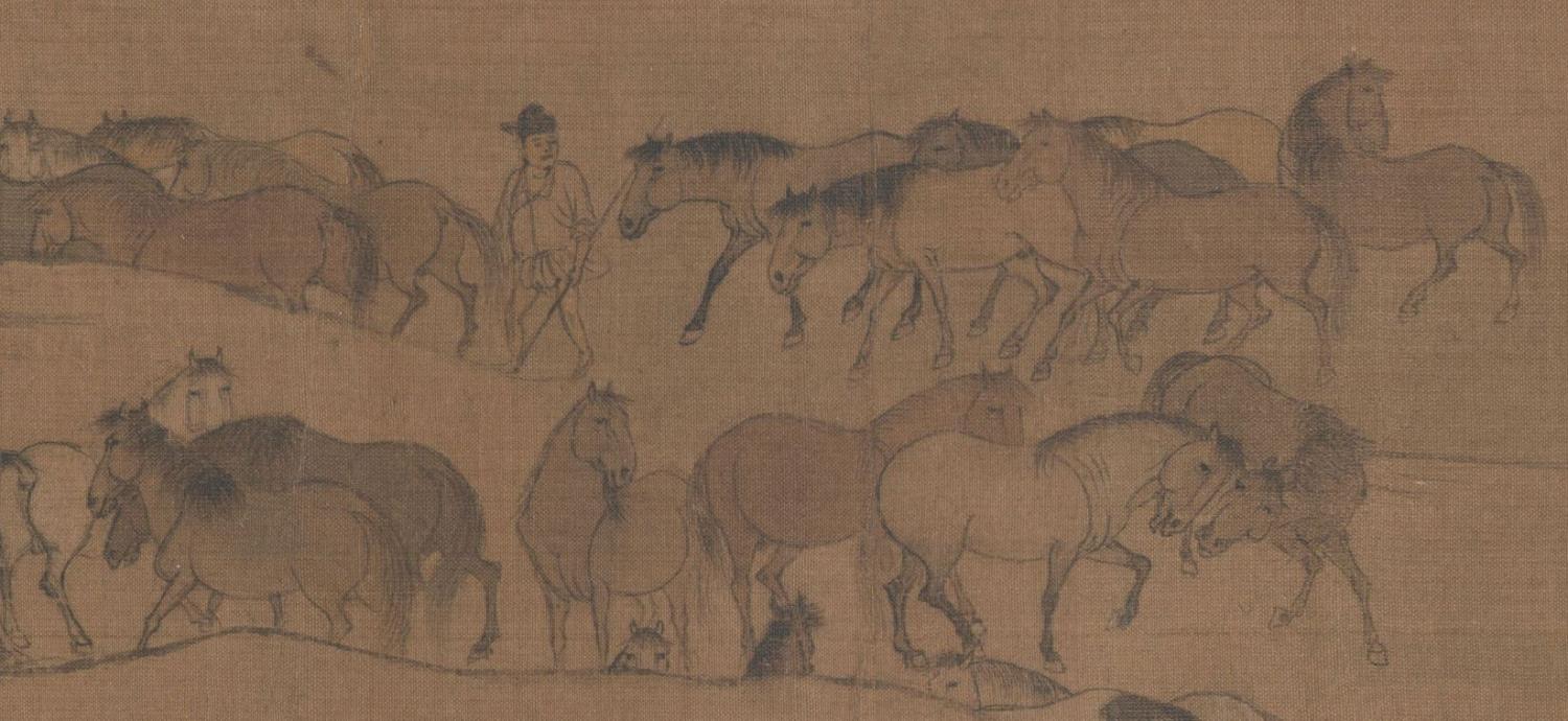 李公麟的大部分绘画作品是画在纸上的,并不施色彩,“惟临摹古画,用绢素着色”(元·汤垕《画鉴》)。这件作品为临摹本,用绢素作画并施淡彩,与画史的记载完全吻合。唐朝画家韦偃已无可靠的作品存世,通过李公麟的这个摹本,也可以领略其绘画的风采。