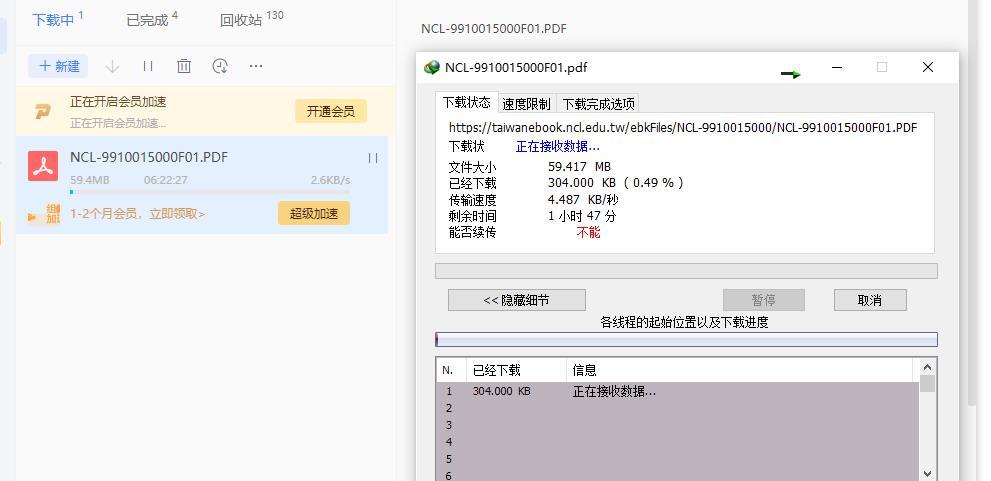轩辕十四游客未老师好,请问打开上面链接:https://taiwanebook.ncl.edu.tw/zh-tw/book/NCL-004759779 浏览器转半天,打开该资料转半天,最后取得PDF按KB走,迅雷或IDM都试了,不知您那边也是如此吗?