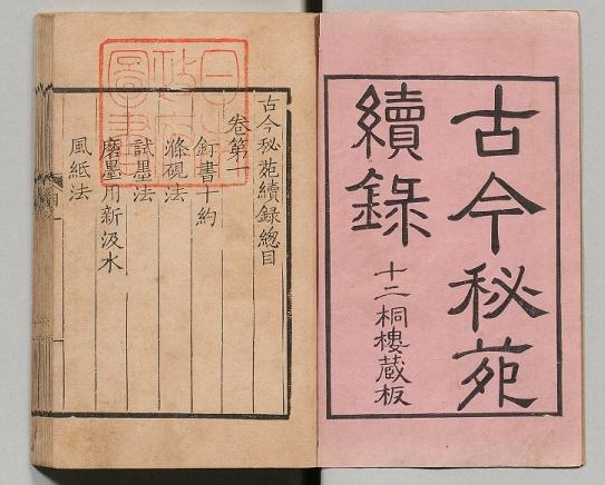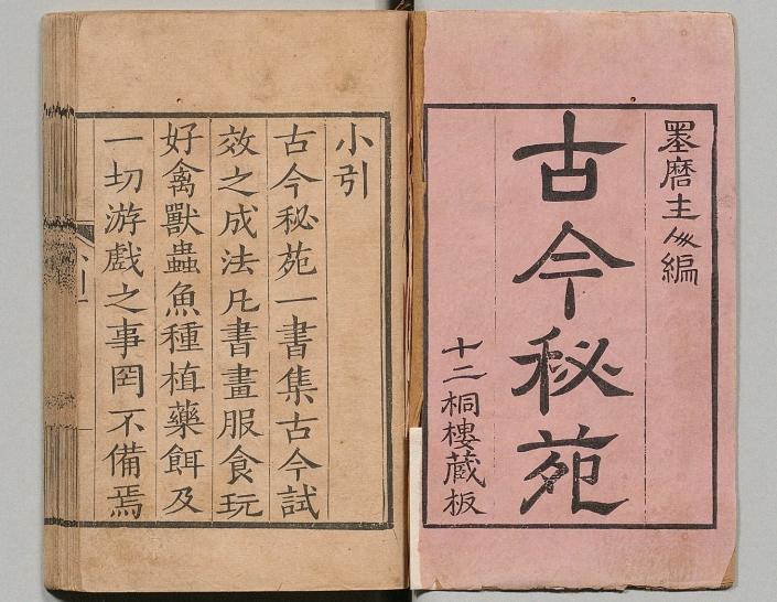 古今秘苑一部,正编十五卷,续编十三卷。起首有磨墨主人小引,暂见本未标明时间,当为清人。现存刻本数量巨大,优劣不一,为嘉庆以后同光之间的典型坊刻风格。