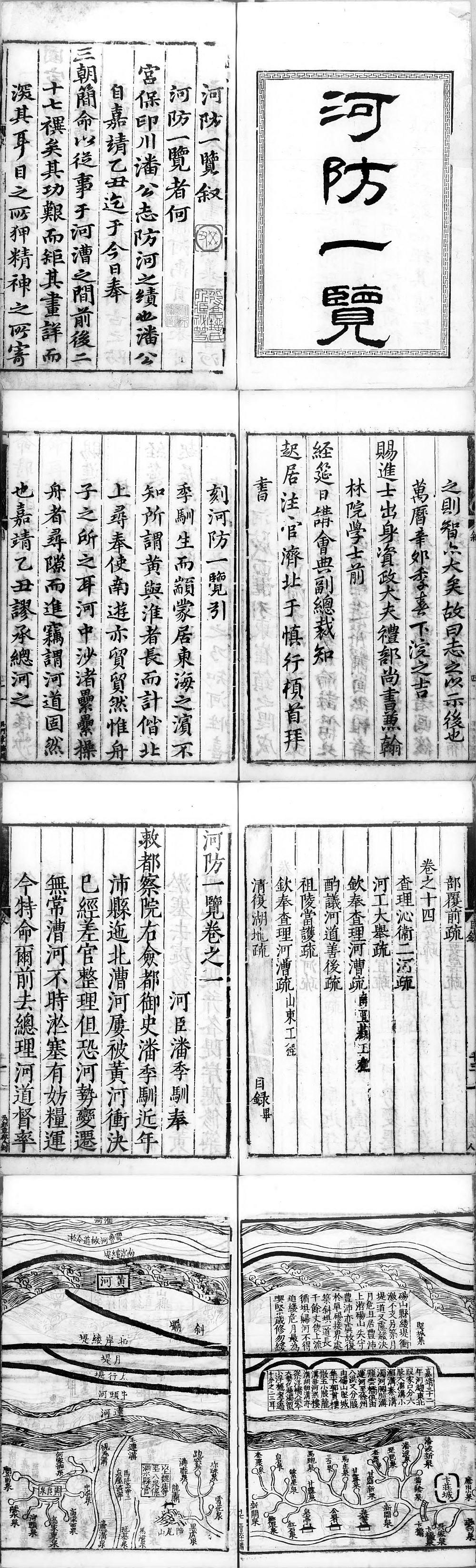《河防—览》 为古代著名河工专著之一。明代治河专家潘季驯的代表作,成书于万历十八年(1590年),初刻于万历十九年 (1591)。全书共14卷,记录了潘季驯治理黄河、准河、运河的基本思想和主要措施。
