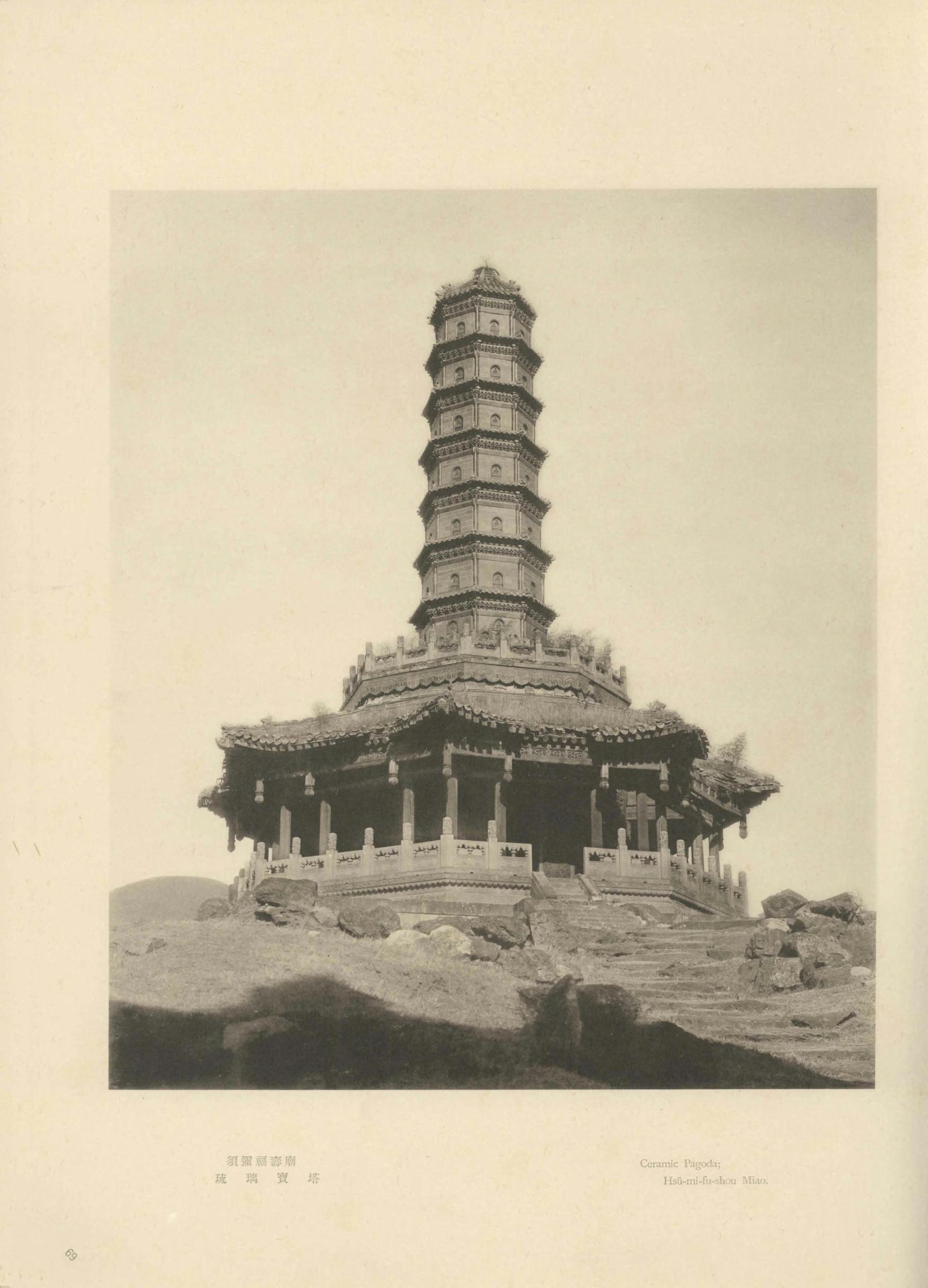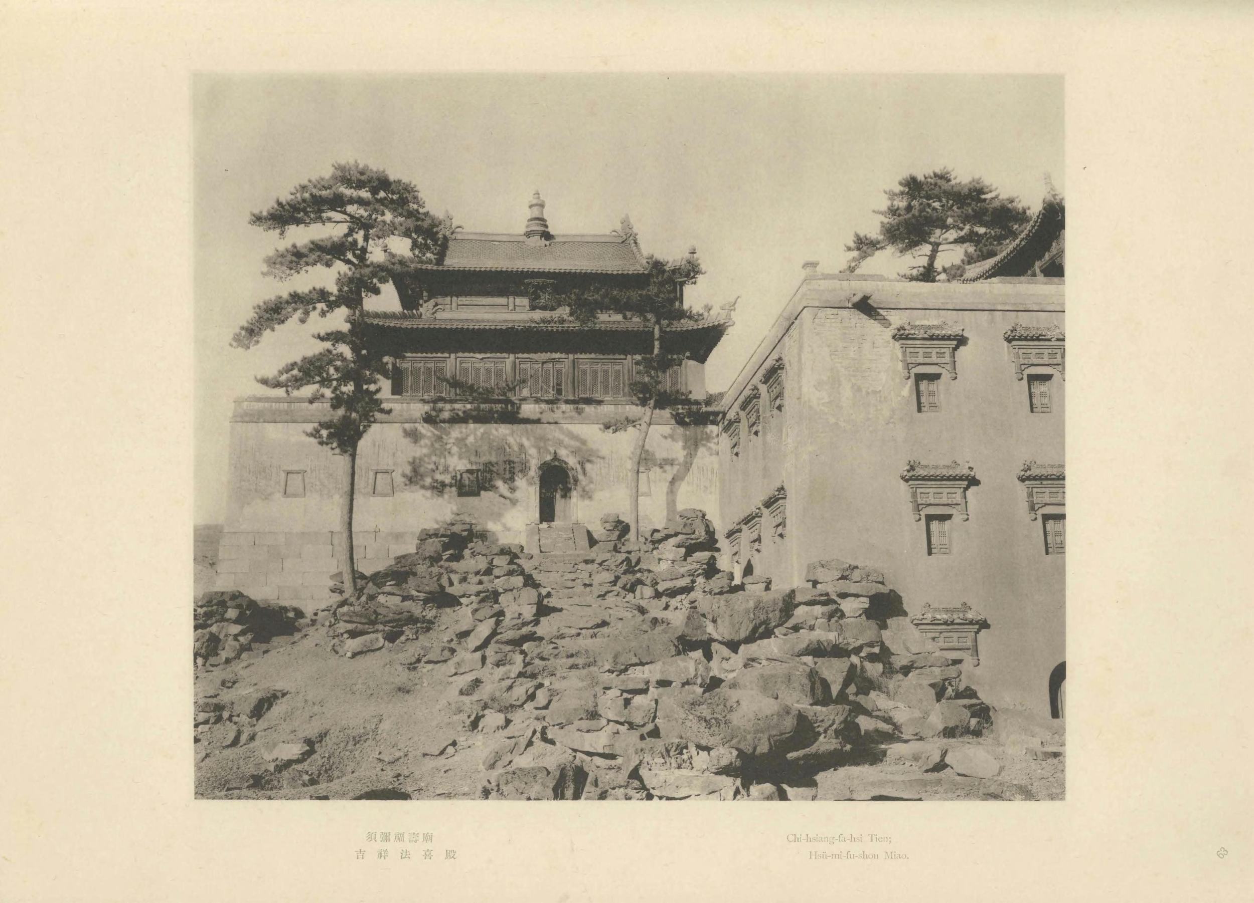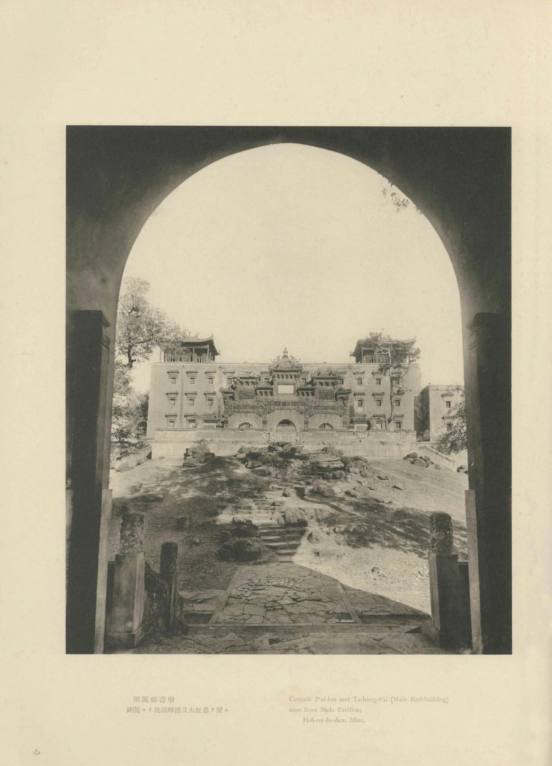 震旦在佛经中泛指今天的中国。此《震旦旧迹图汇》由日本摄影师山本明(山本赞七郎长子)辑编。全书分:云冈石窟、北京及其附近旧迹两辑(图版四卷,两辑各一百幅),拍摄时间大约是 1916 年至 1921 年。此为日本昭和八年(1933)东京山本写真场摄影本。