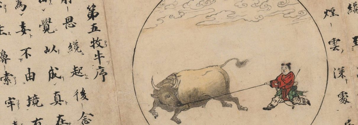 /23 评论/分类 子部, 宋辽金, 宗教玄学类, 稿钞本, 绘画 /撰自 未曾此《十牛图颂并序》南宋廓庵禅师著。其内容是以牧牛为主题,用十幅图画(寻牛、见迹、见牛、得牛、牧牛、骑牛归家、忘牛存人、人牛俱忘、返本还源、入鄽垂手),寓意禅宗修心证道如牧牛。一序 ( 著语 ) 、一颂 ( 诗 ) 、一图。此卷约绘制于日本弘安元年(1278),现藏于大都会艺术博物馆。