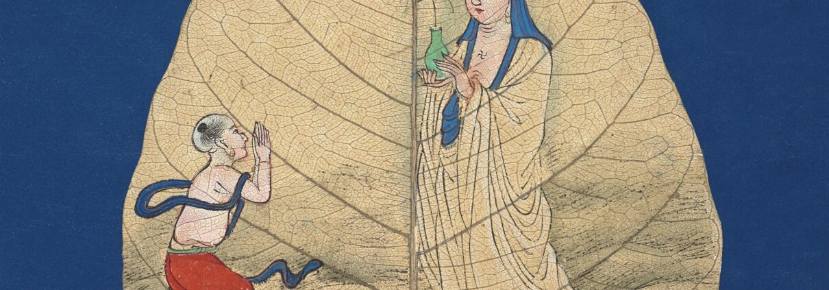 此套《菩提叶罗汉画》是以菩提树叶为素材媒介创作的画册。将菩提叶特殊处理后,再平铺在蓝色底纸上作画,多彩的画面和谐地与树叶的肌理自然美融为一体。此内含彩绘及墨绘本:现寿者相、彩绘佛像集、画罗汉写心经及金刚经本、画十八罗汉、画十六罗汉并书赞等共六种,约绘制于清代。