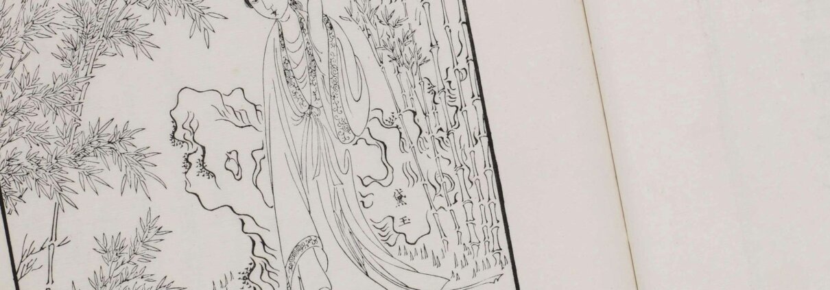 第一册 “黛玉” 一幅图画中之 “玉” 字有长扁之别,原刻本 “玉” 字较扁,翻刻本 “玉” 字较长。伊藤漱平在文章中说,原刻本与翻刻本的区别,除了板框的尺寸与钤印有异之外,画中人物的名字笔划,原刻横长,翻刻纵长,并举 “黛玉” 一幅作为说明。故以扁玉字本为佳。