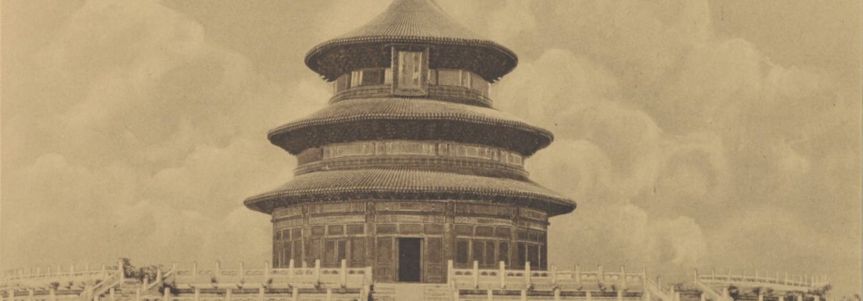 此《Temple of Heaven》(天坛)是美国摄影师 John D. ZUMBRUN(约翰·詹布鲁恩)的北京相关影像影画册的第三部。全册含照片二十七幅,影像记录:天坛入口、祈年殿、皇穹宇、圜丘等建筑景观十九帧及袁世凯 1914 年冬至祭天场景八帧。此本约出版于 1914 年。