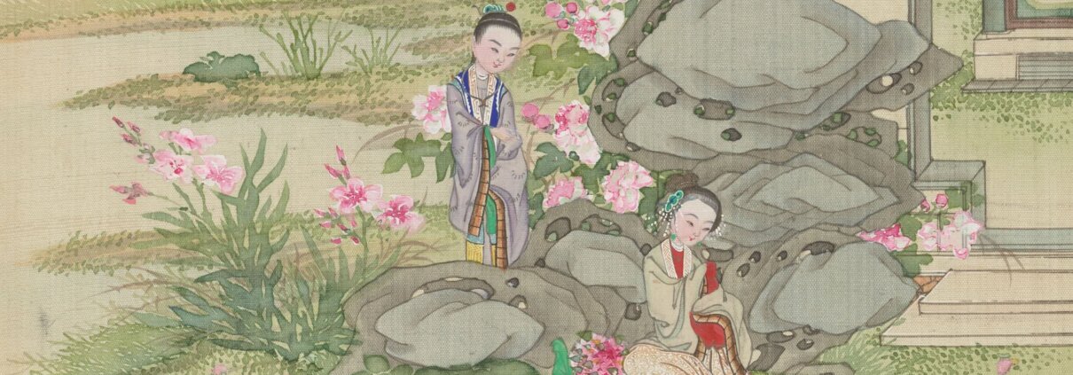 /13 评论/分类 清代, 绘画, 艺术类 /撰自 未曾此《红楼梦赋图册》由清代沈谦作赋,盛昱录。全套共二十幅(此本缺一帧),内容为沈谦撰二十首题咏红楼梦的赋文配以精美插图,包含:贾宝玉梦游太虚境赋、怡红院开夜宴赋、稻香村课子赋、葬花赋、四美钓鱼赋、病补孔雀裘赋、芦雪亭赏雪赋等。此本大约绘于清同治十二年,现藏于爱尔兰 Chester Beatty 博物馆。