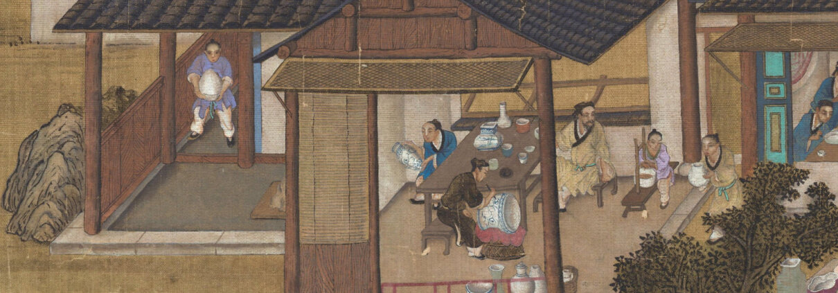 开铺:图中所见欧洲人手持两袋货币到中国瓷商购货,很可能就是十八世纪后期的国际货币西班牙银元。