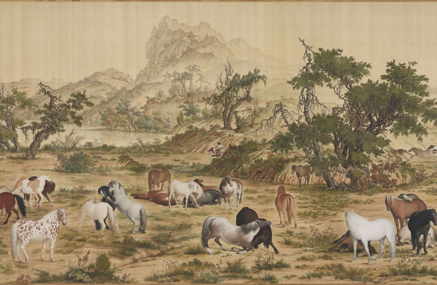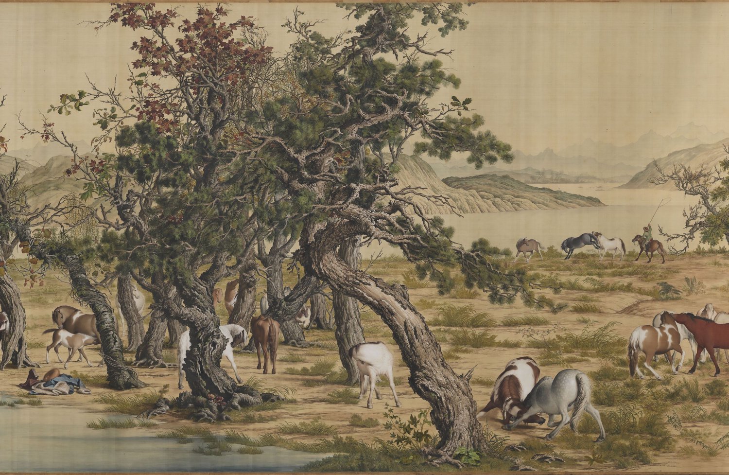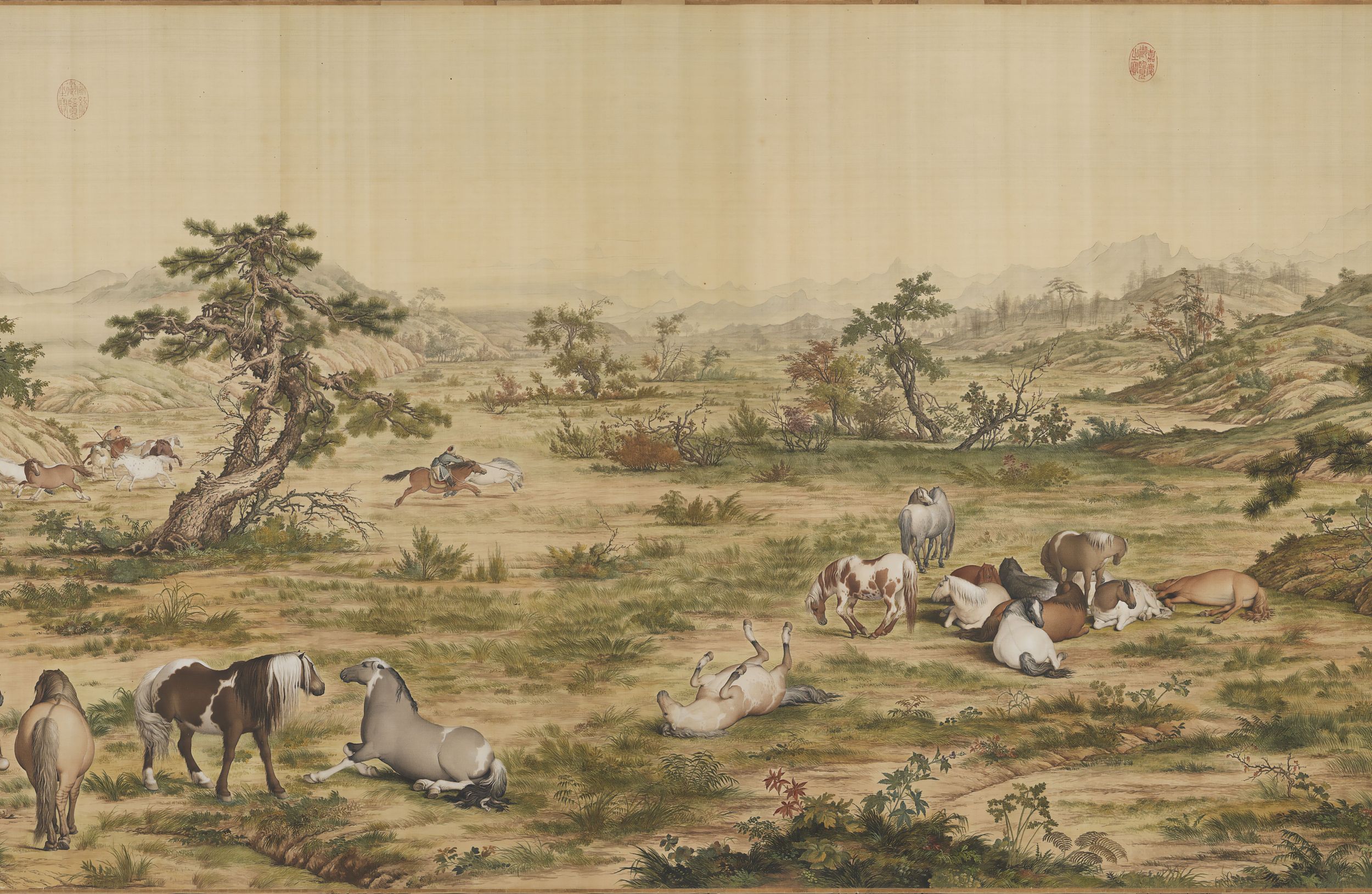 画卷由两棵占满画幅纵高的松树开启。在将近八米的横幅画面中,山水景观的地平线都维持在画卷三分之二高度位置处,将平原牧放、林间散马、河岸浴马、涉水过险以及瞭望千里河山等段落,组构成一个壮阔的牧马景观。全幅色彩浓丽,构图繁复,形象逼肖,郎氏擅以中国传统绘画技法加入西洋光影透视法及西画颜料,以呈现出中西趣味兼容并蓄的画面。如画中马匹、人物、树木、土坡皆应用了光的原理,使物象极富立体感;而如松针、树皮、草叶等的墨线勾勒,石块土坡的皴擦等仍沿袭了中国传统技法,即使是马匹及树干上的阴影表现,也是以中国传统的渲染方法来完成。